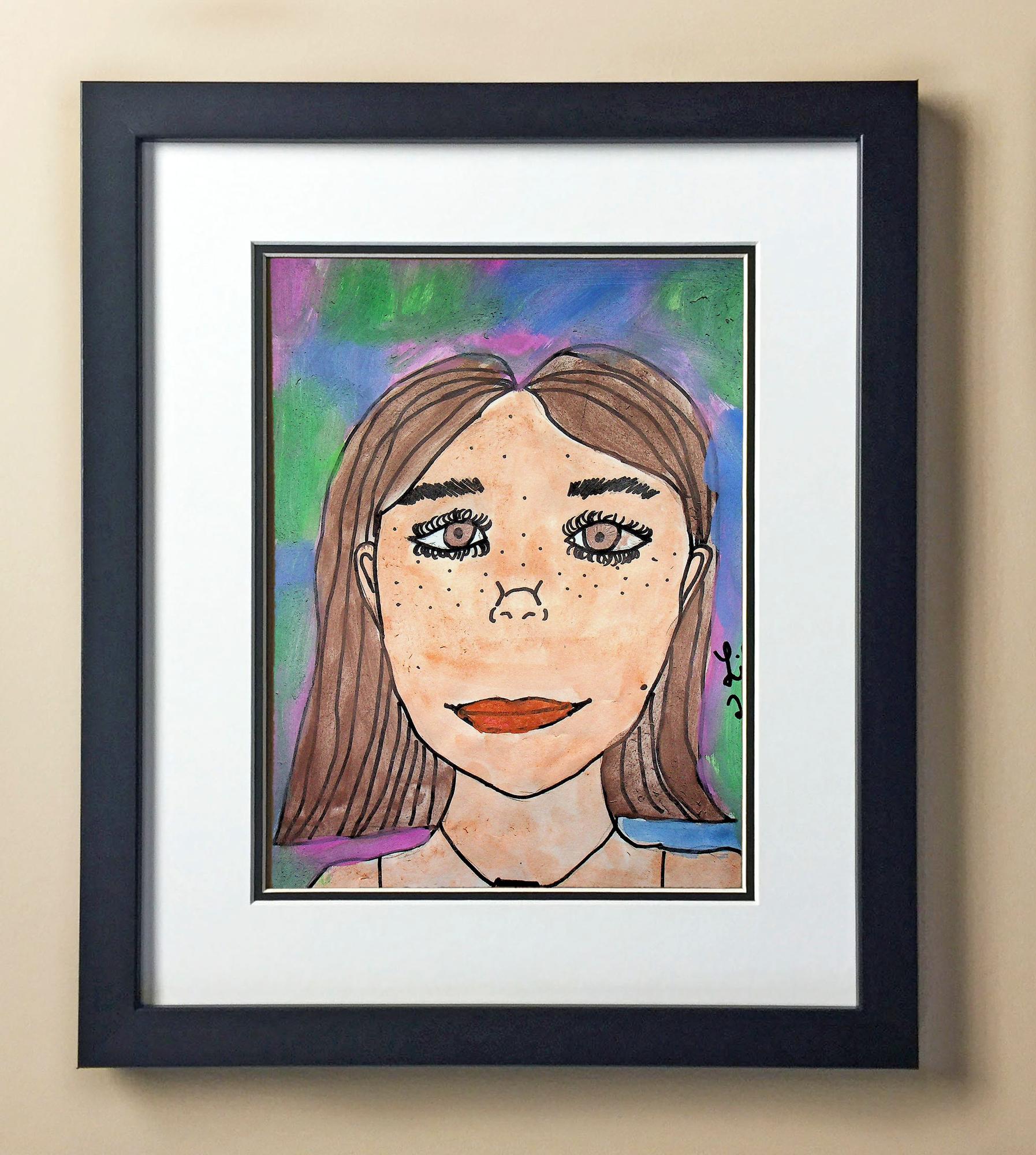 Included with the purchase is the Students Artwork, Frame, double matboard, shatter proof plexiglass, and a ready to hang backerboard with turnbuttons
