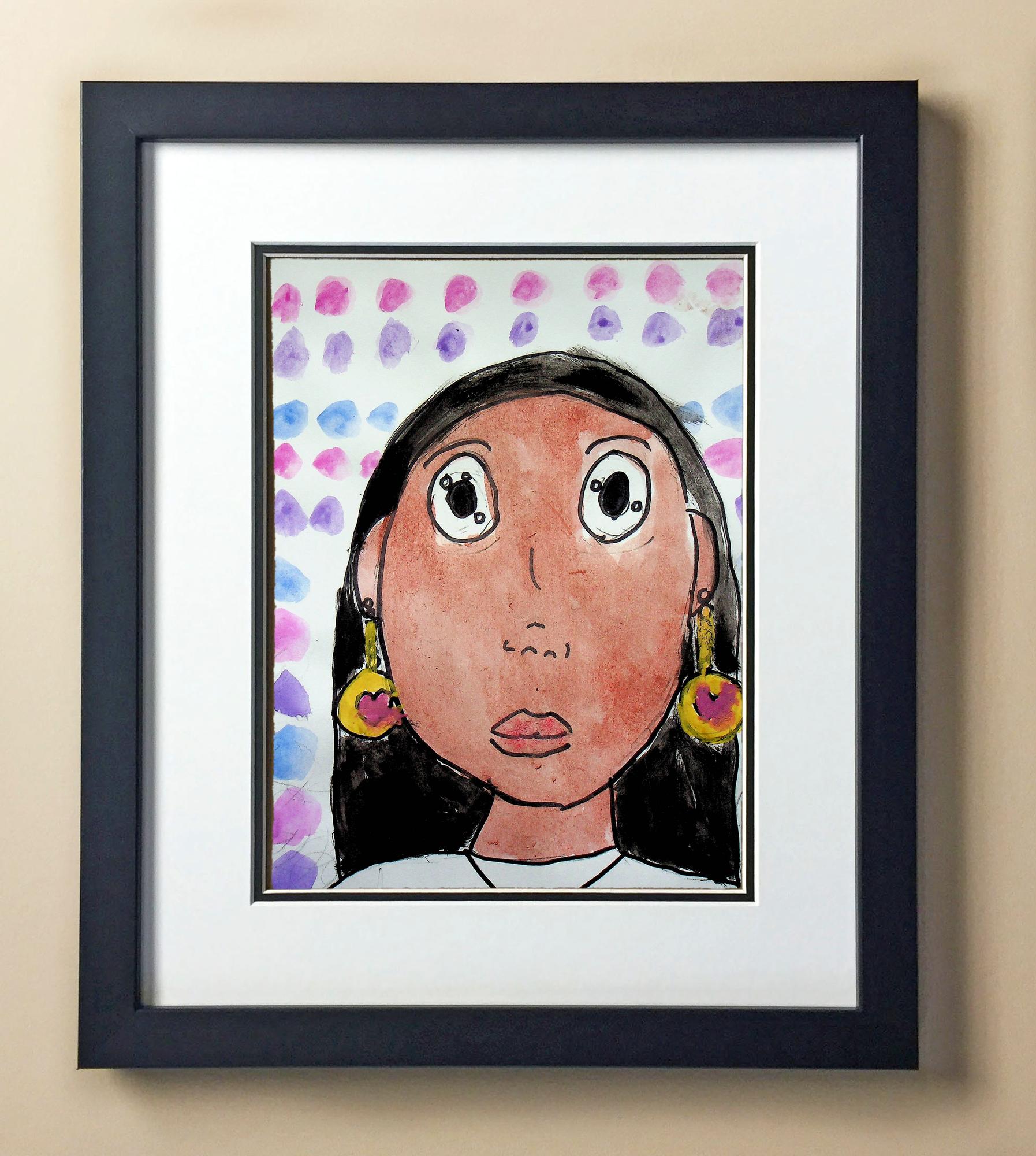 Included with the purchase is the Students Artwork, Frame, double matboard, shatter proof plexiglass, and a ready to hang backerboard with turnbuttons