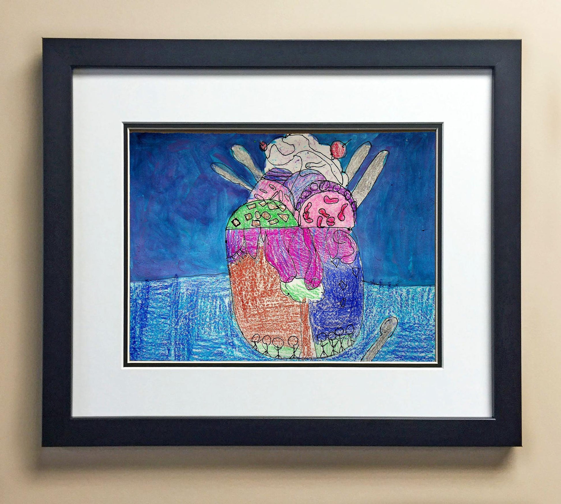 Included with the purchase is the Students Artwork, Frame, double matboard, shatter proof plexiglass, and a ready to hang backerboard with turnbuttons