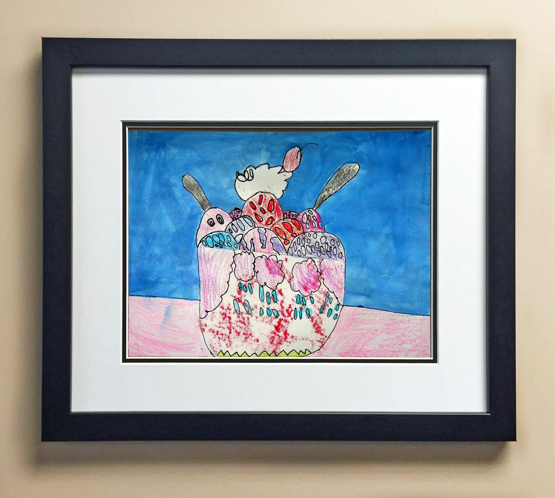 Included with the purchase is the Students Artwork, Frame, double matboard, shatter proof plexiglass, and a ready to hang backerboard with turnbuttons