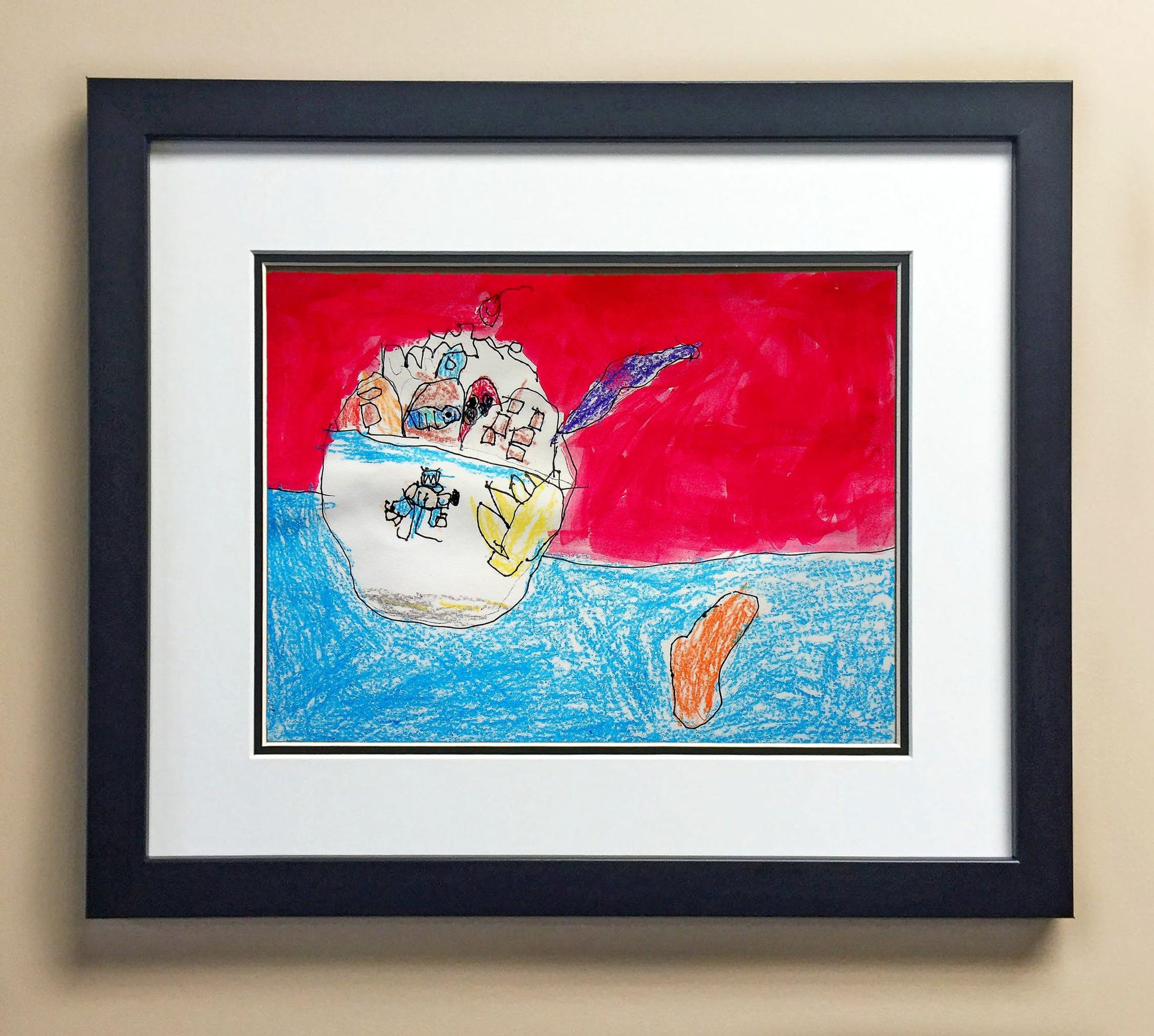 Included with the purchase is the Students Artwork, Frame, double matboard, shatter proof plexiglass, and a ready to hang backerboard with turnbuttons