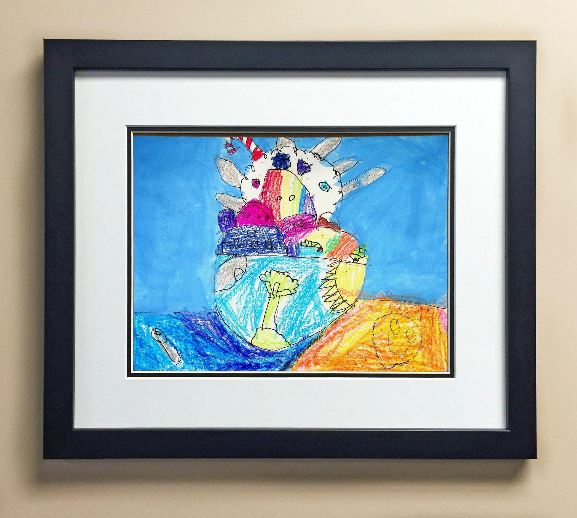Included with the purchase is the Students Artwork, Frame, double matboard, shatter proof plexiglass, and a ready to hang backerboard with turnbuttons