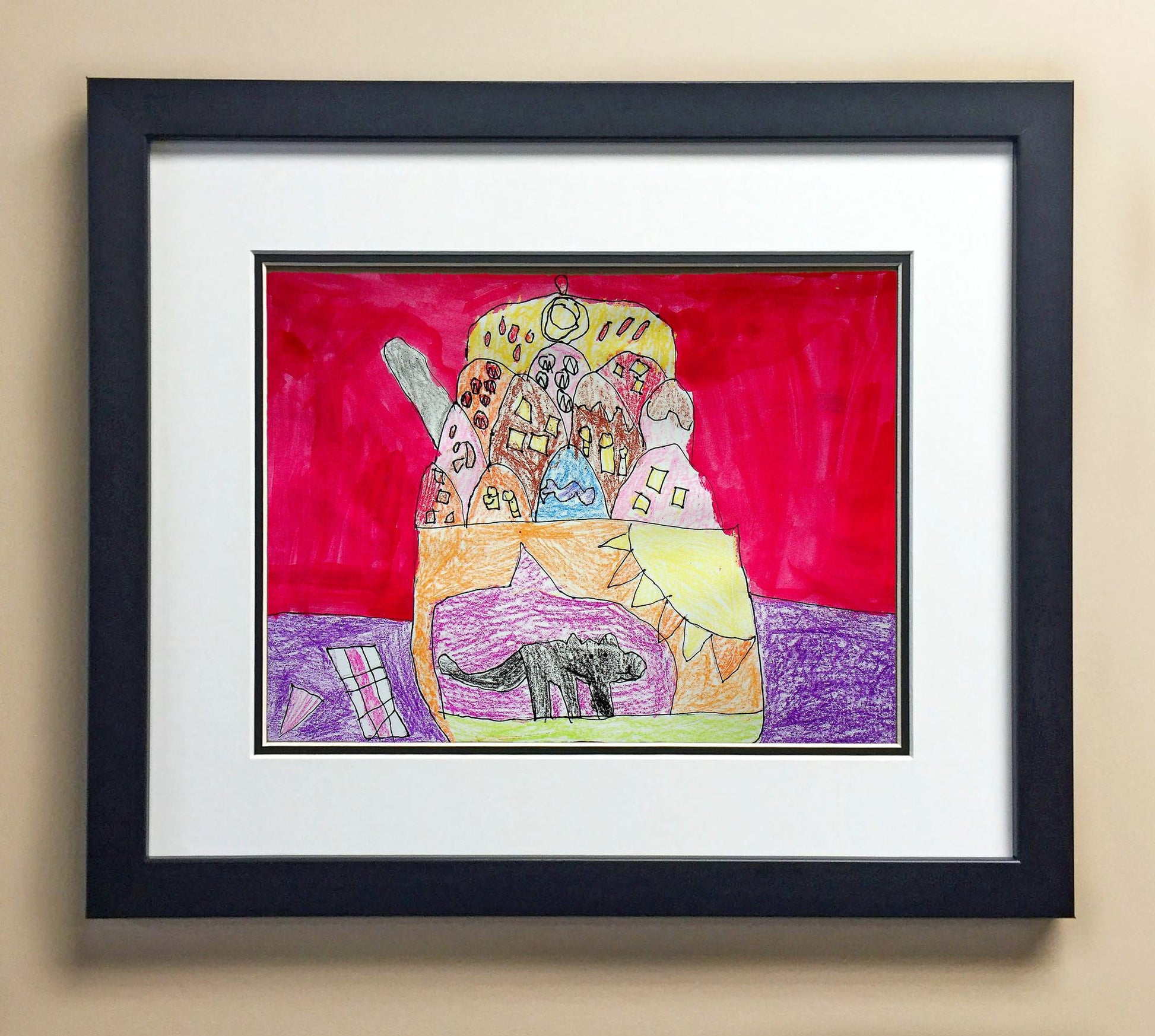 Included with the purchase is the Students Artwork, Frame, double matboard, shatter proof plexiglass, and a ready to hang backerboard with turnbuttons