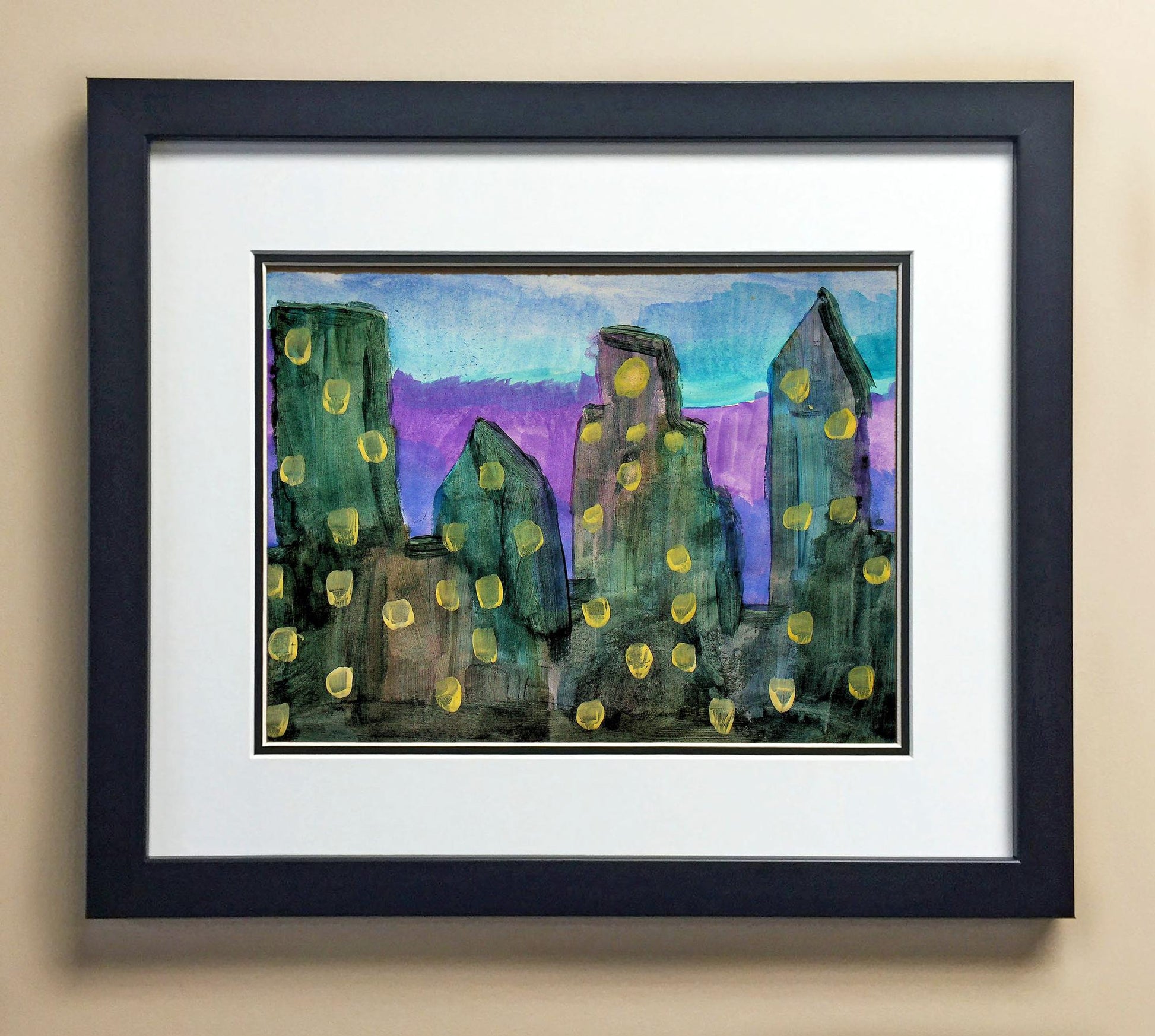 Included with the purchase is the Students Artwork, Frame, double matboard, shatter proof plexiglass, and a ready to hang backerboard with turnbuttons