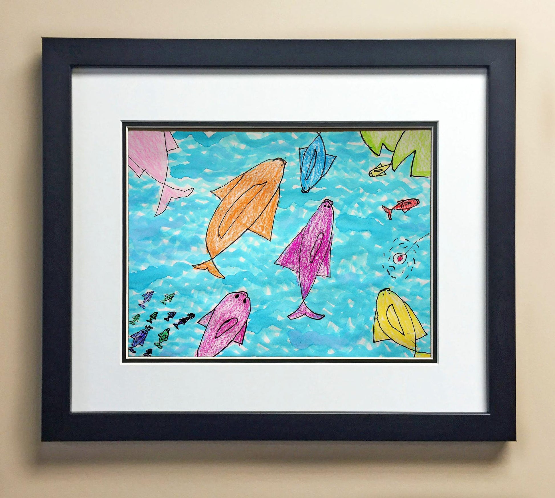 Included with the purchase is the Students Artwork, Frame, double matboard, shatter proof plexiglass, and a ready to hang backerboard with turnbuttons