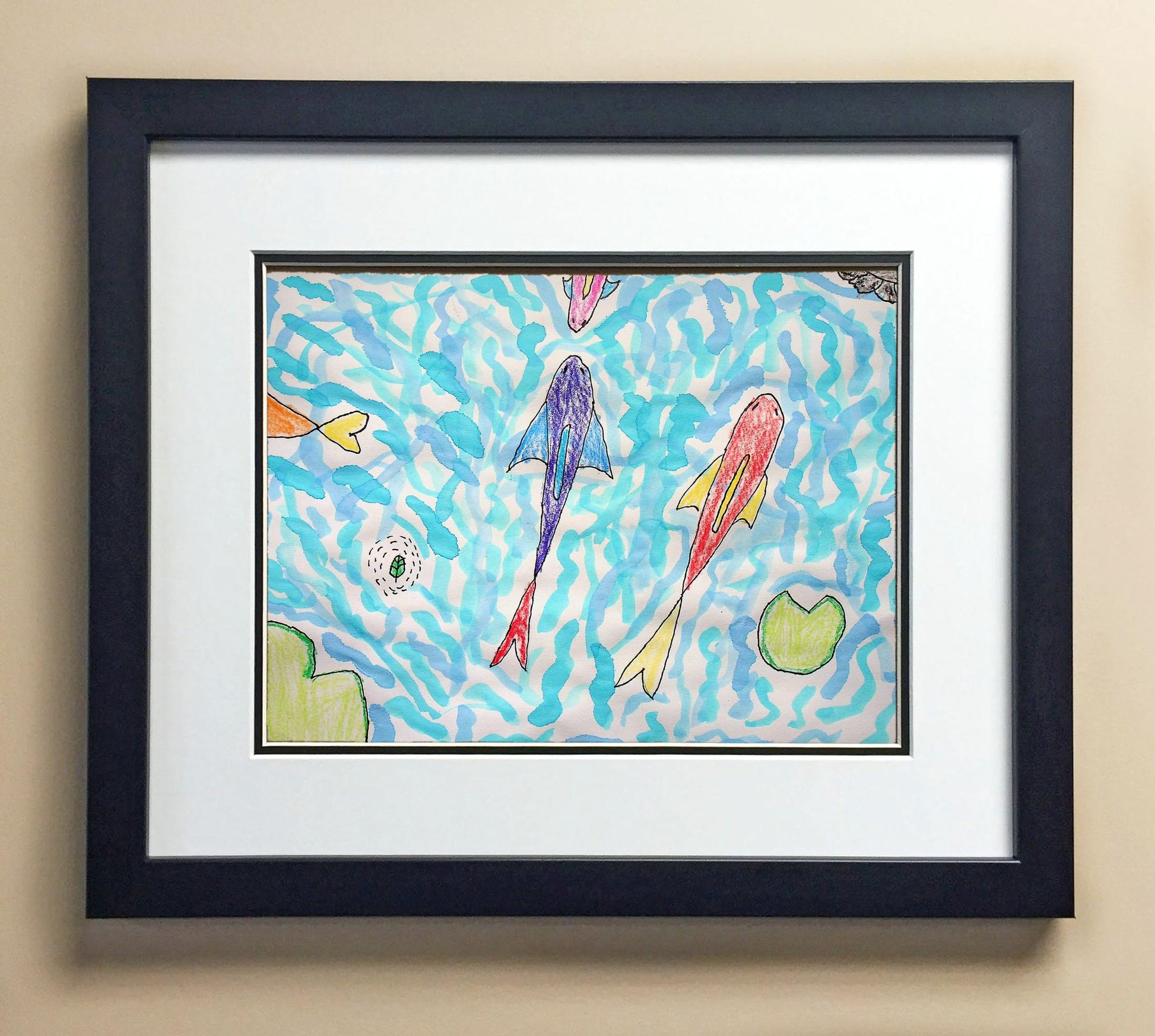 Included with the purchase is the Students Artwork, Frame, double matboard, shatter proof plexiglass, and a ready to hang backerboard with turnbuttons