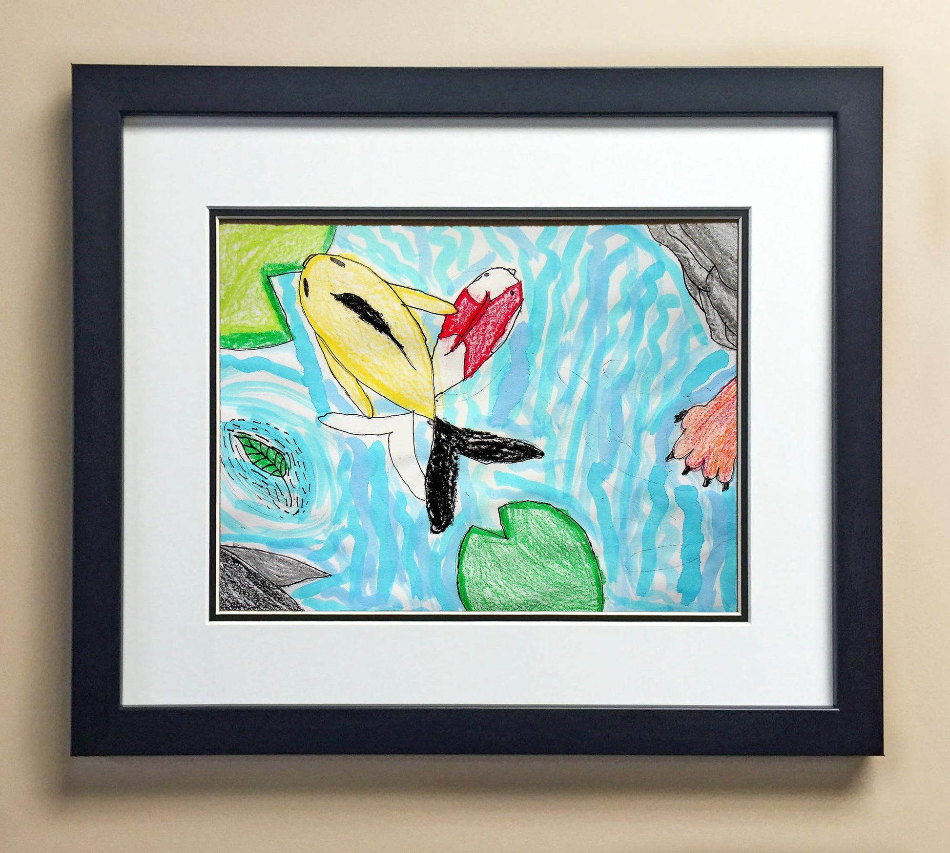 Included with the purchase is the Students Artwork, Frame, double matboard, shatter proof plexiglass, and a ready to hang backerboard with turnbuttons