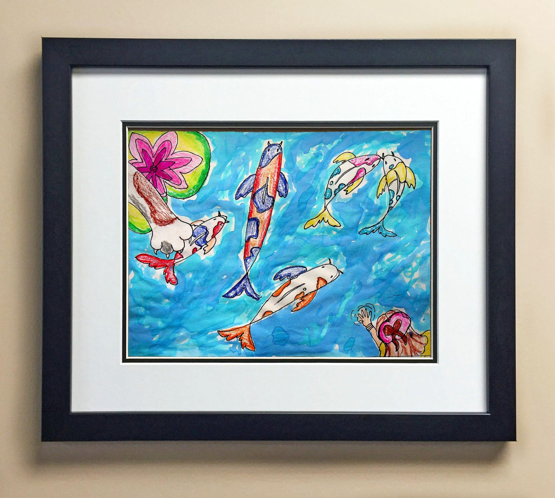 Included with the purchase is the Students Artwork, Frame, double matboard, shatter proof plexiglass, and a ready to hang backerboard with turnbuttons