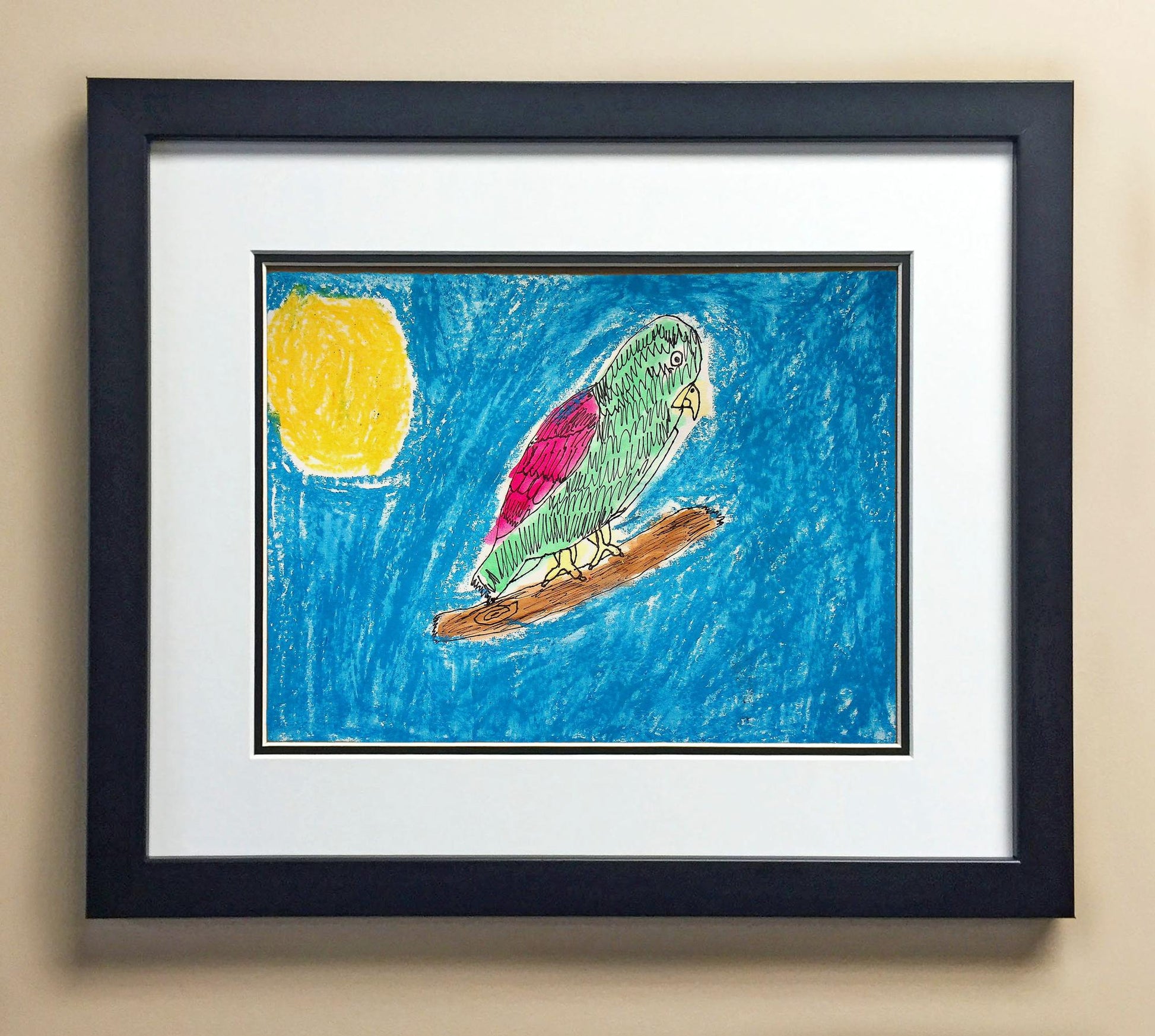 Included with the purchase is the Students Artwork, Frame, double matboard, shatter proof plexiglass, and a ready to hang backerboard with turnbuttons