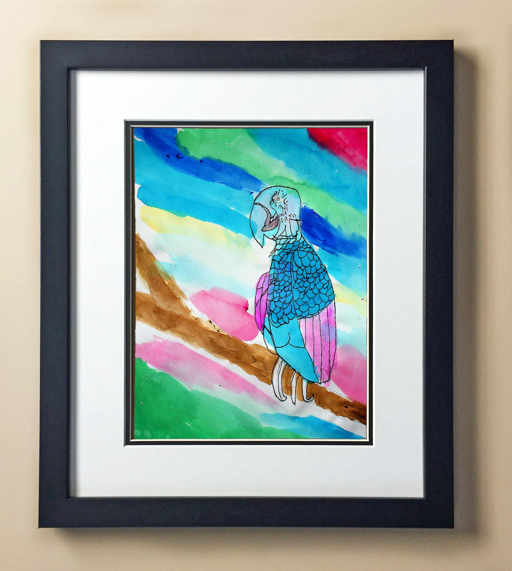 Included with the purchase is the Students Artwork, Frame, double matboard, shatter proof plexiglass, and a ready to hang backerboard with turnbuttons