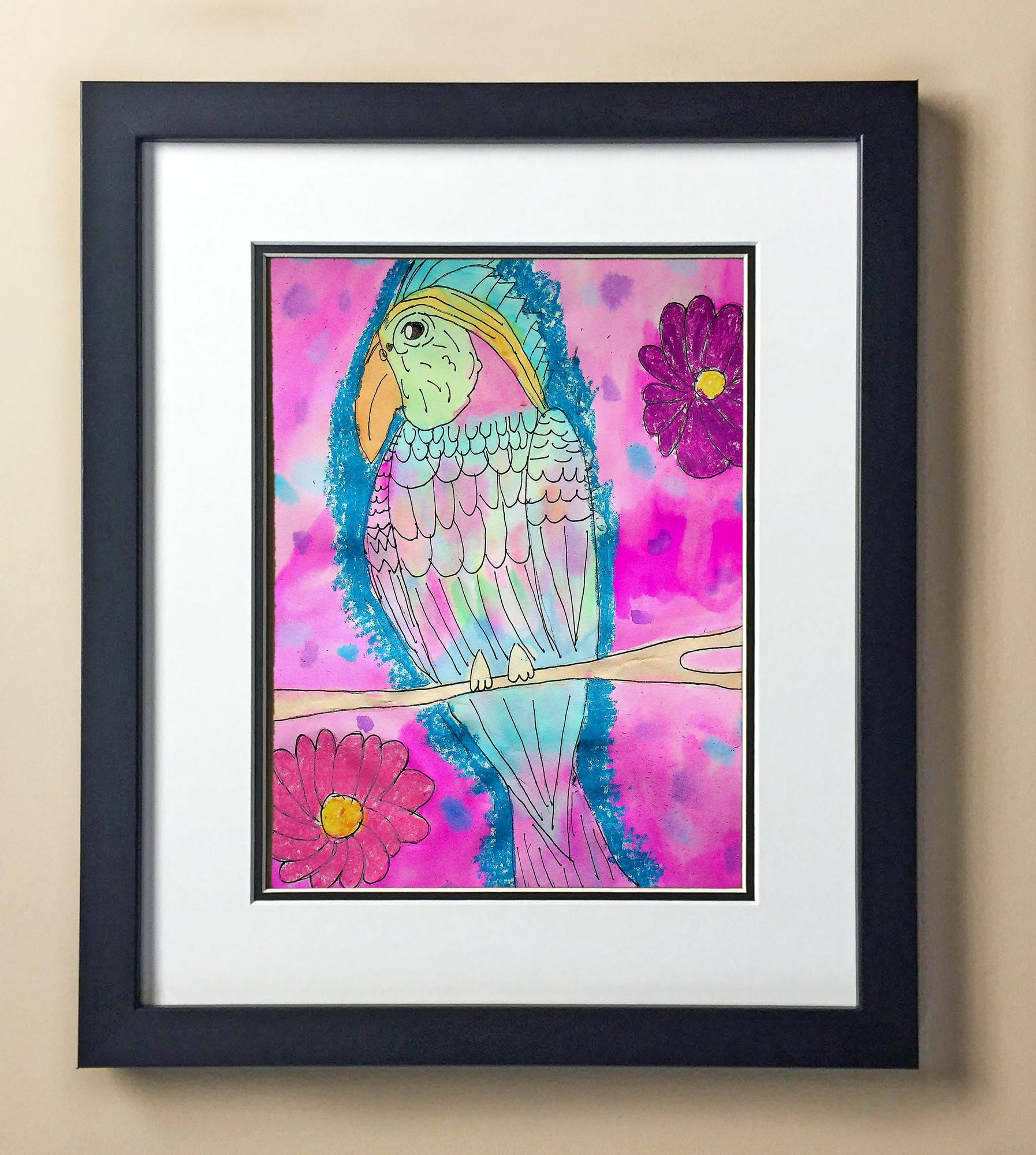 Included with the purchase is the Students Artwork, Frame, double matboard, shatter proof plexiglass, and a ready to hang backerboard with turnbuttons