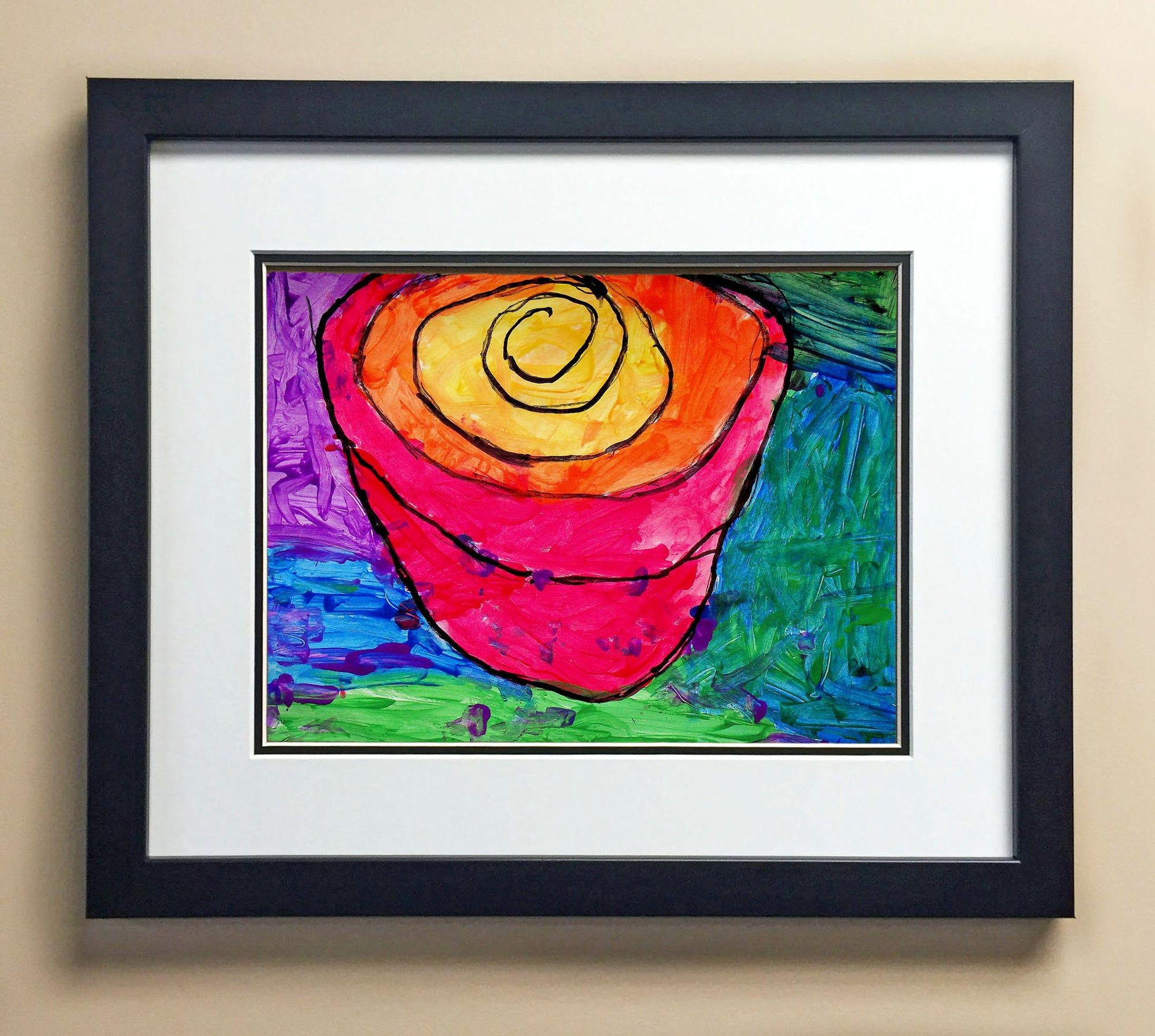 Included with the purchase is the Students Artwork, Frame, double matboard, shatter proof plexiglass, and a ready to hang backerboard with turnbuttons