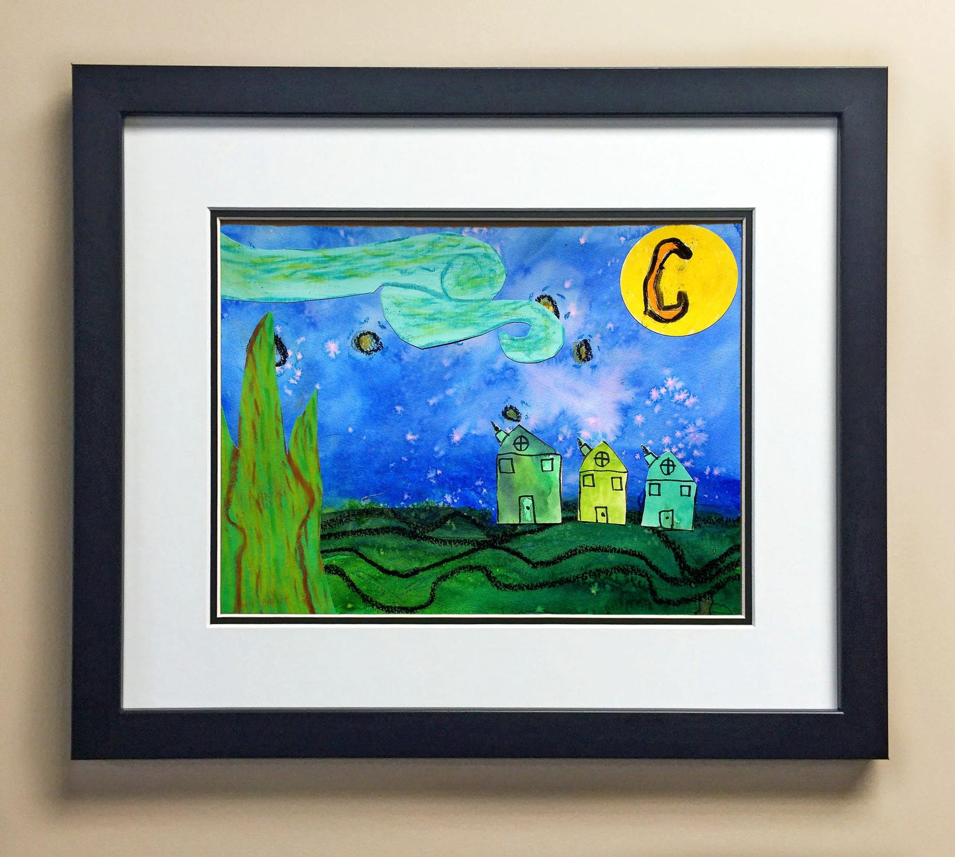 Included with the purchase is the Students Artwork, Frame, double matboard, shatter proof plexiglass, and a ready to hang backerboard with turnbuttons