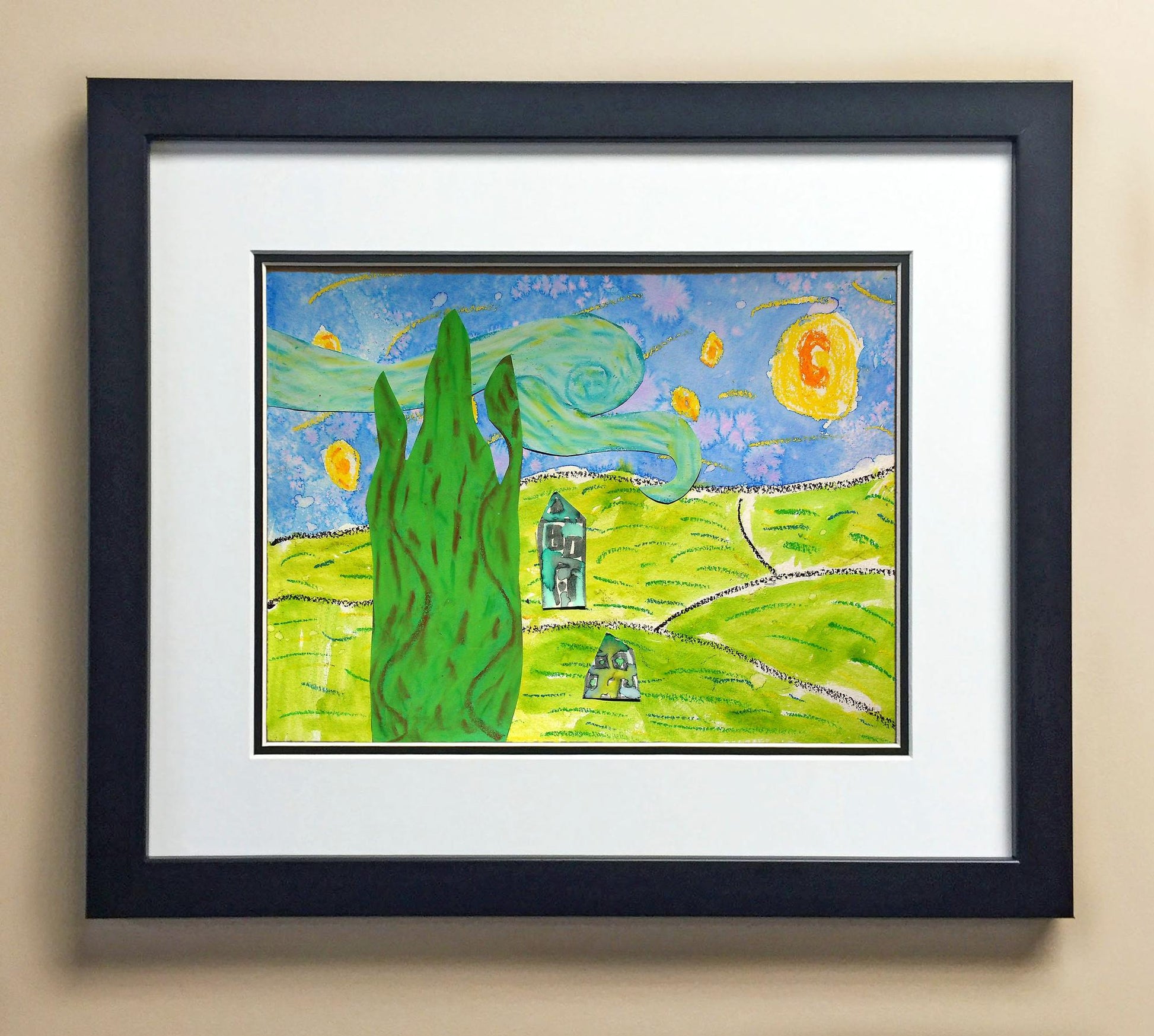 Included with the purchase is the Students Artwork, Frame, double matboard, shatter proof plexiglass, and a ready to hang backerboard with turnbuttons