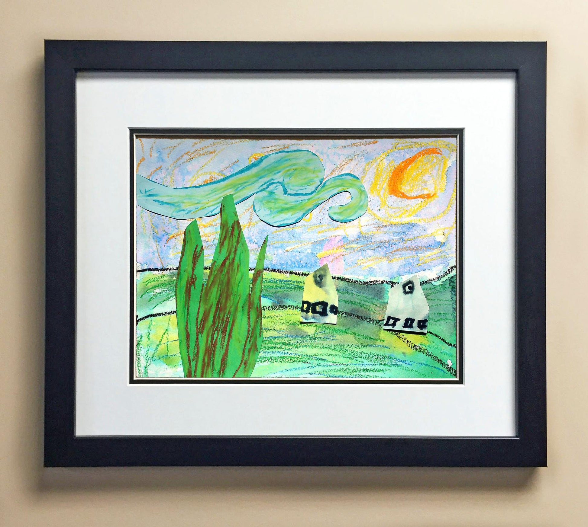 Included with the purchase is the Students Artwork, Frame, double matboard, shatter proof plexiglass, and a ready to hang backerboard with turnbuttons
