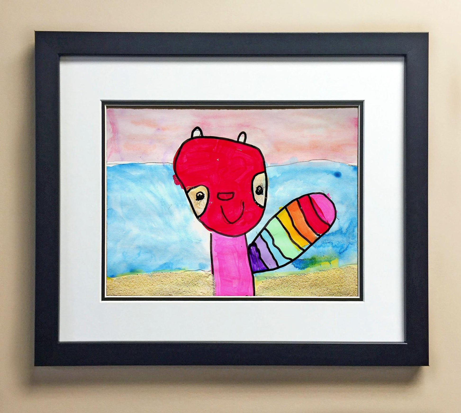 Included with the purchase is the Students Artwork, Frame, double matboard, shatter proof plexiglass, and a ready to hang backerboard with turnbuttons