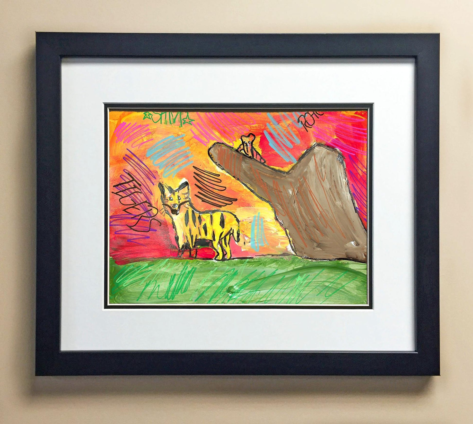 Included with the purchase is the Students Artwork, Frame, double matboard, shatter proof plexiglass, and a ready to hang backerboard with turnbuttons
