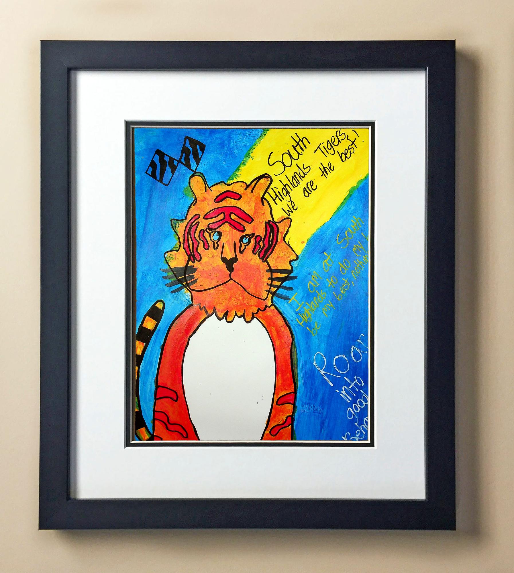 Included with the purchase is the Students Artwork, Frame, double matboard, shatter proof plexiglass, and a ready to hang backerboard with turnbuttons
