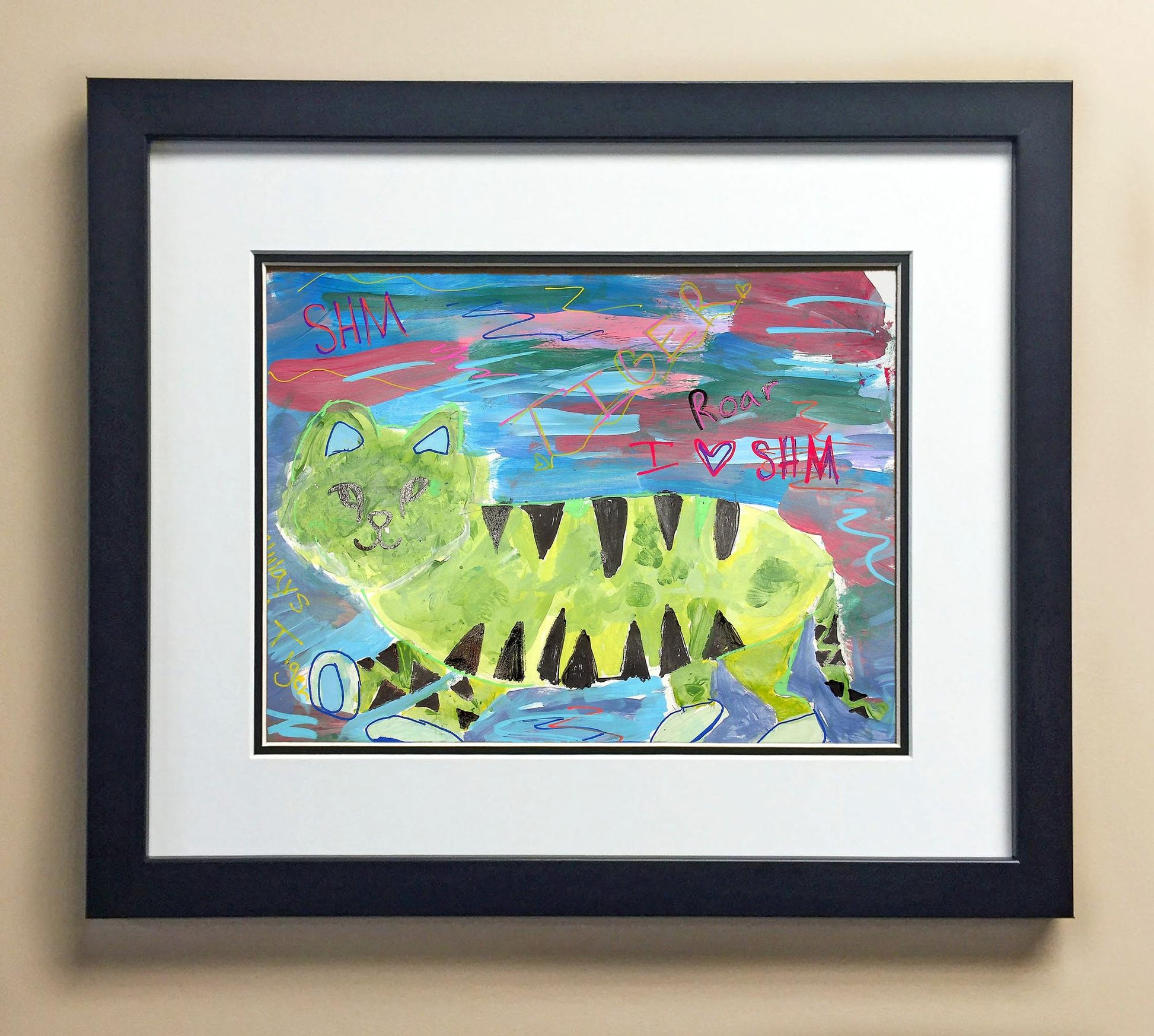 Included with the purchase is the Students Artwork, Frame, double matboard, shatter proof plexiglass, and a ready to hang backerboard with turnbuttons