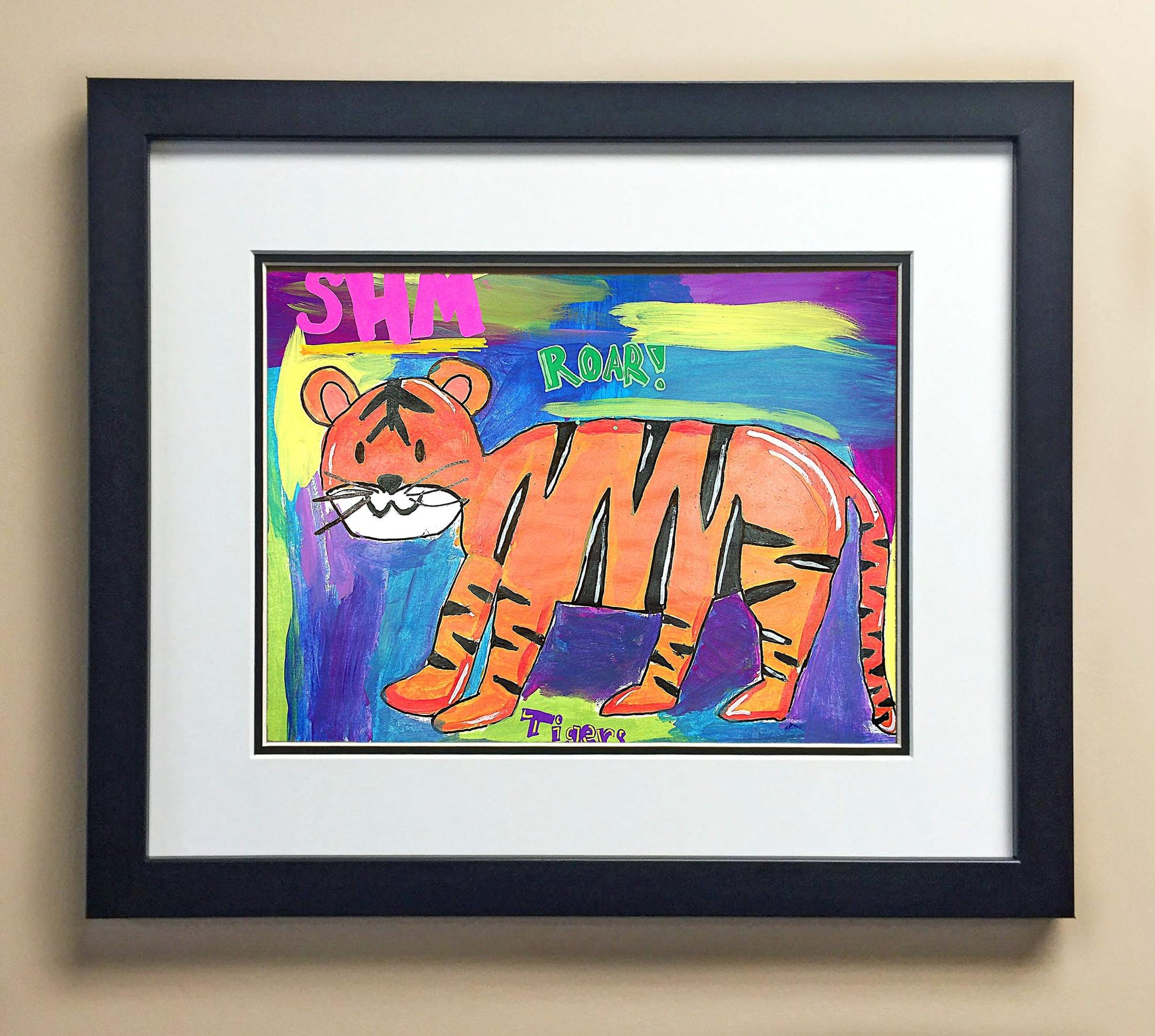 Included with the purchase is the Students Artwork, Frame, double matboard, shatter proof plexiglass, and a ready to hang backerboard with turnbuttons