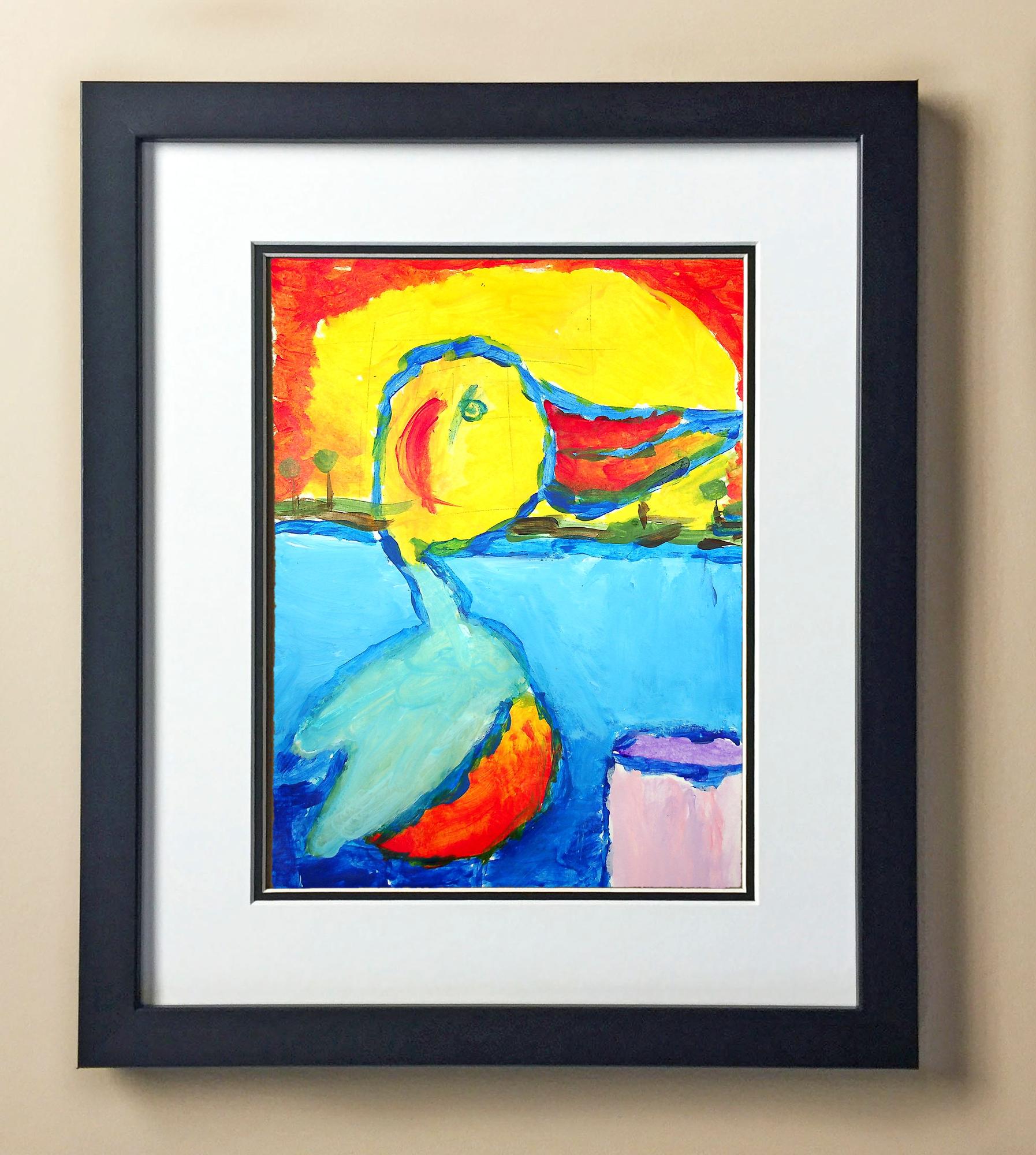 Included with the purchase is the Students Artwork, Frame, double matboard, shatter proof plexiglass, and a ready to hang backerboard with turnbuttons
