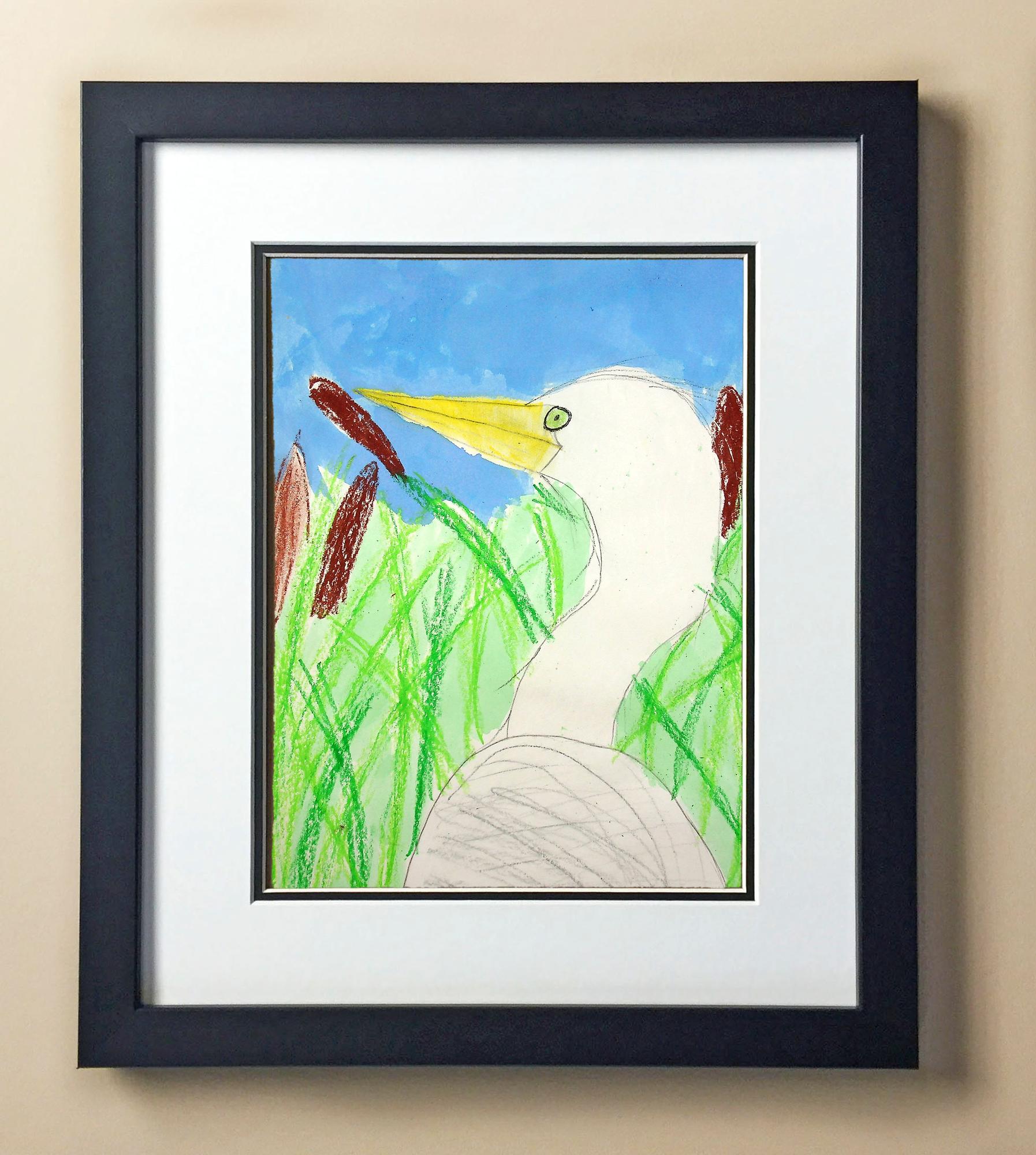 Included with the purchase is the Students Artwork, Frame, double matboard, shatter proof plexiglass, and a ready to hang backerboard with turnbuttons