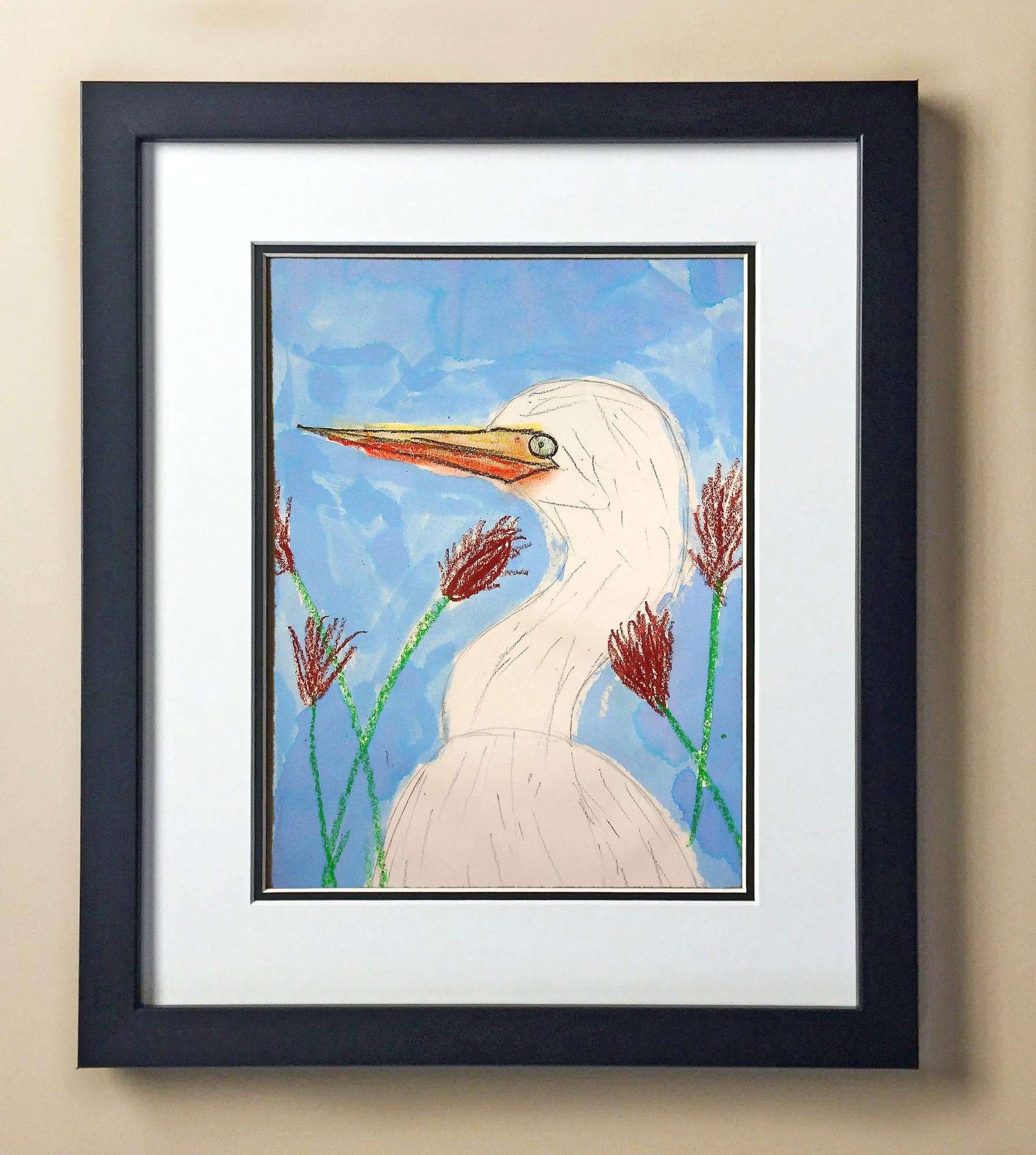 Included with the purchase is the Students Artwork, Frame, double matboard, shatter proof plexiglass, and a ready to hang backerboard with turnbuttons