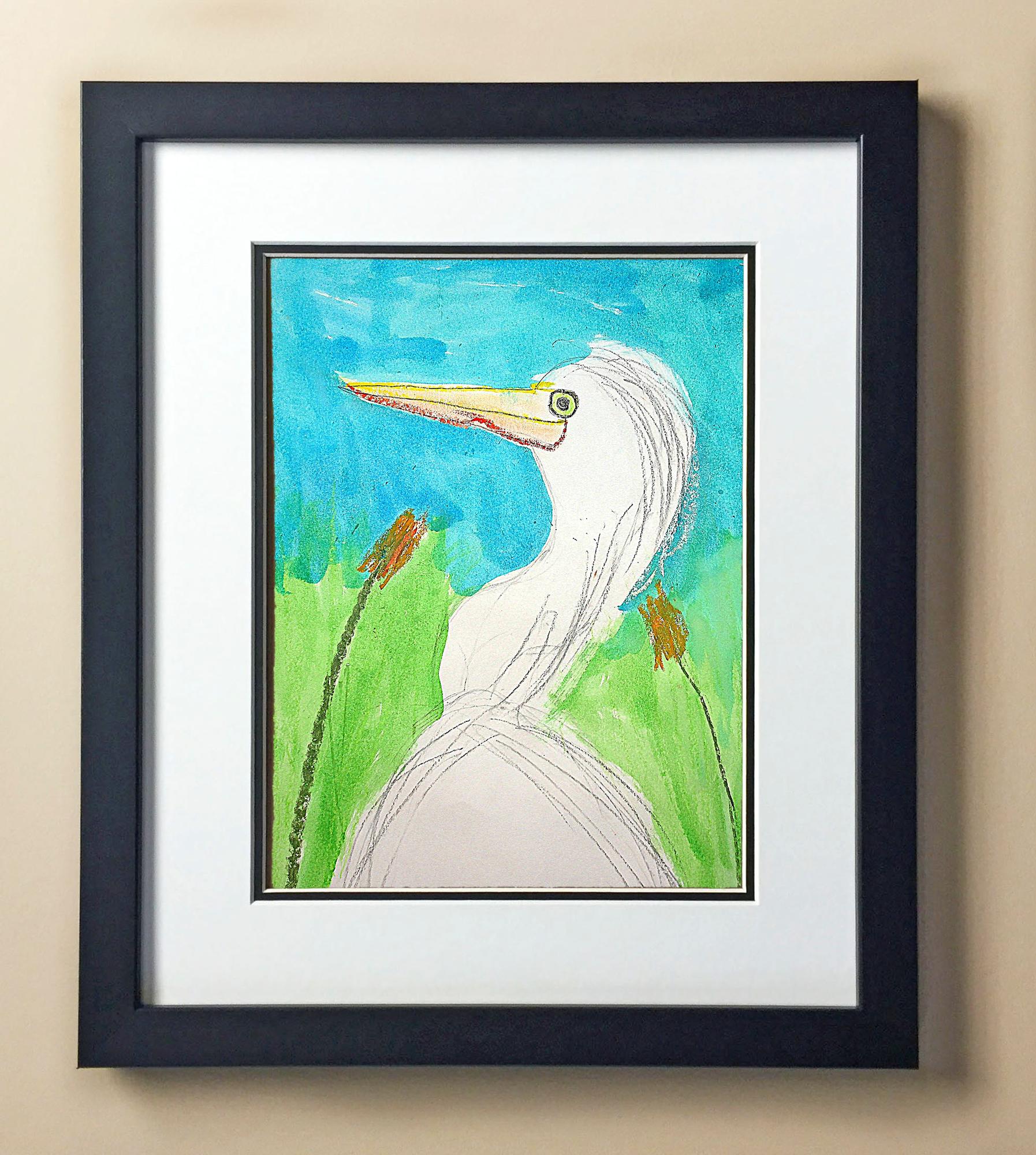 Included with the purchase is the Students Artwork, Frame, double matboard, shatter proof plexiglass, and a ready to hang backerboard with turnbuttons