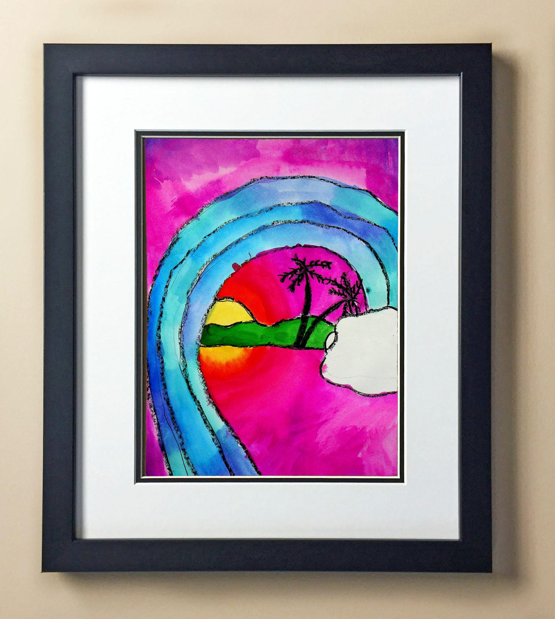 Included with the purchase is the Students Artwork, Frame, double matboard, shatter proof plexiglass, and a ready to hang backerboard with turnbuttons