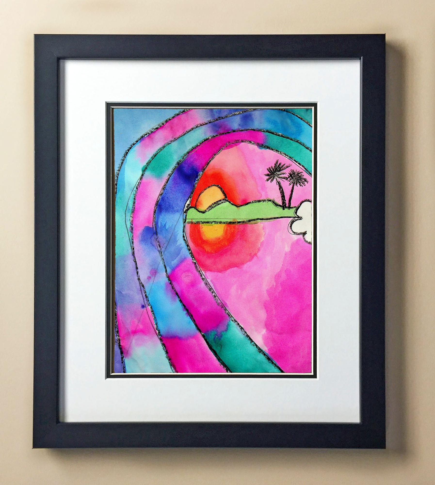 Included with the purchase is the Students Artwork, Frame, double matboard, shatter proof plexiglass, and a ready to hang backerboard with turnbuttons