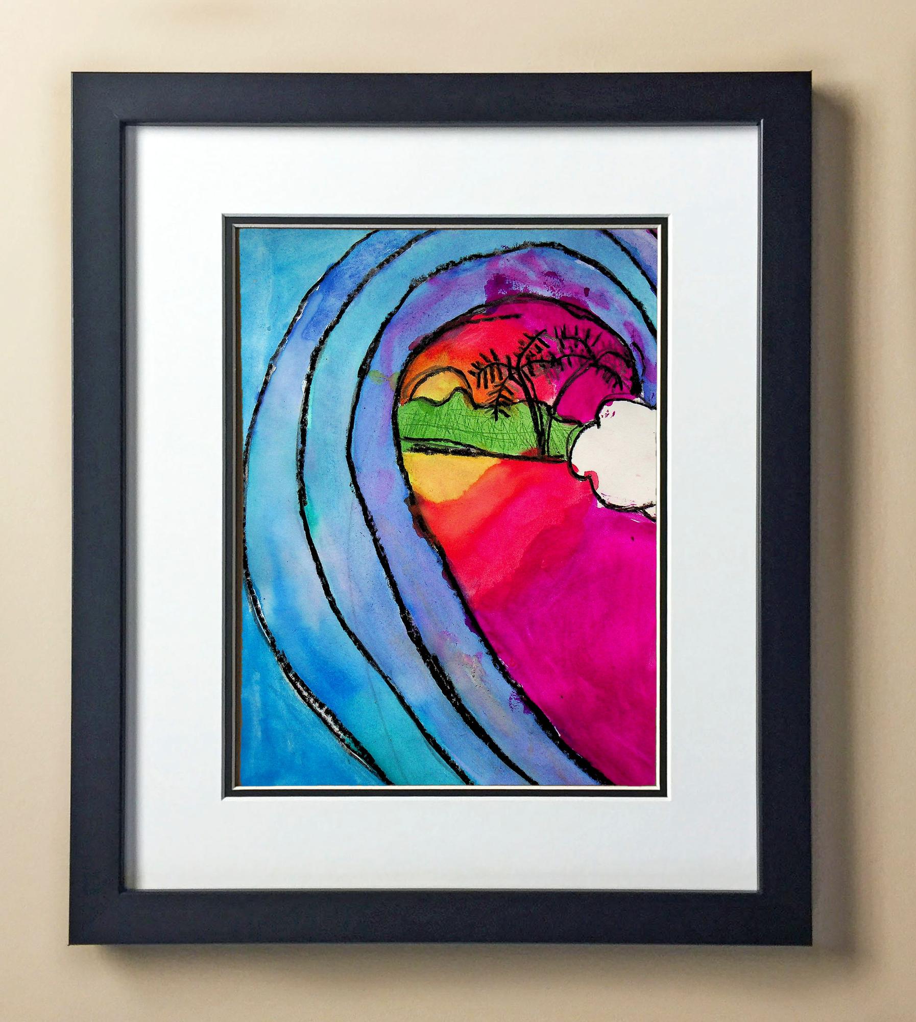 Included with the purchase is the Students Artwork, Frame, double matboard, shatter proof plexiglass, and a ready to hang backerboard with turnbuttons