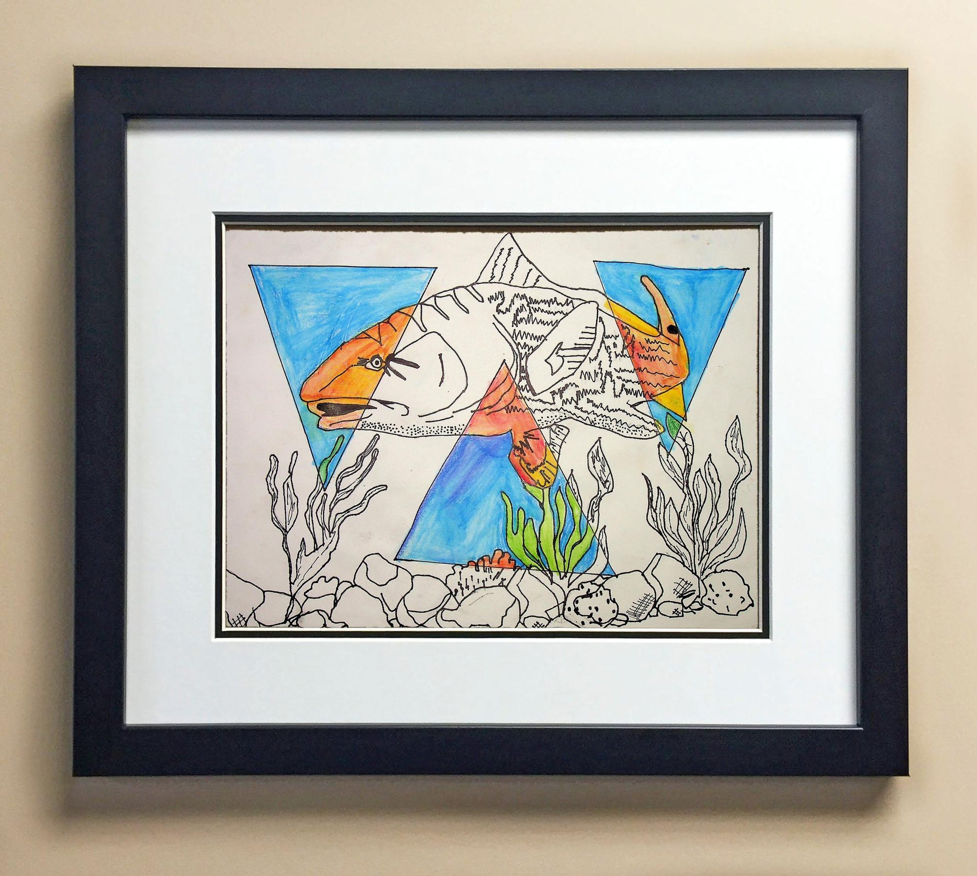 Included with the purchase is the Students Artwork, Frame, double matboard, shatter proof plexiglass, and a ready to hang backerboard with turnbuttons