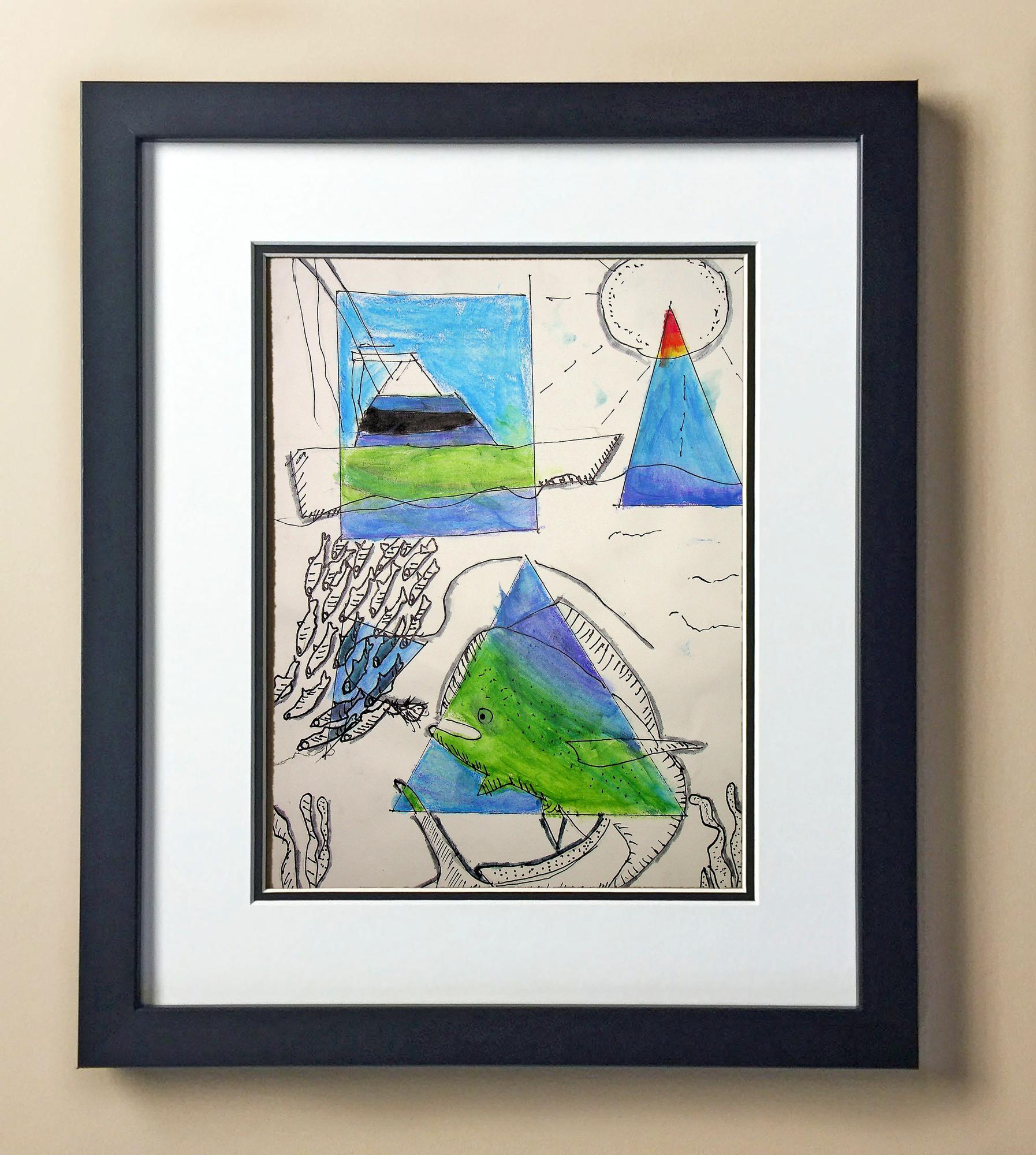 Included with the purchase is the Students Artwork, Frame, double matboard, shatter proof plexiglass, and a ready to hang backerboard with turnbuttons