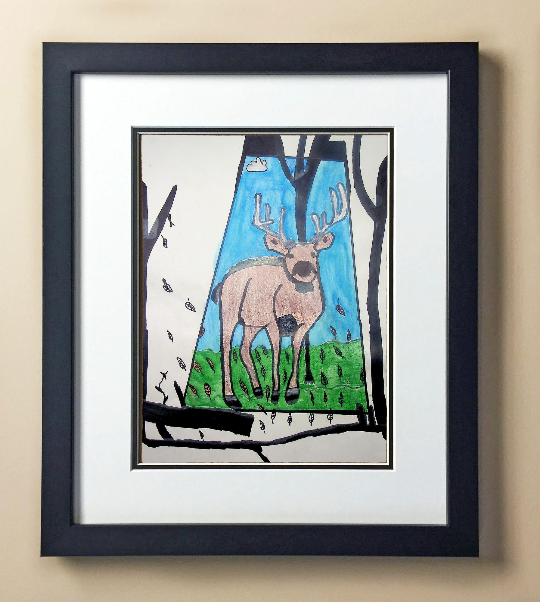 Included with the purchase is the Students Artwork, Frame, double matboard, shatter proof plexiglass, and a ready to hang backerboard with turnbuttons