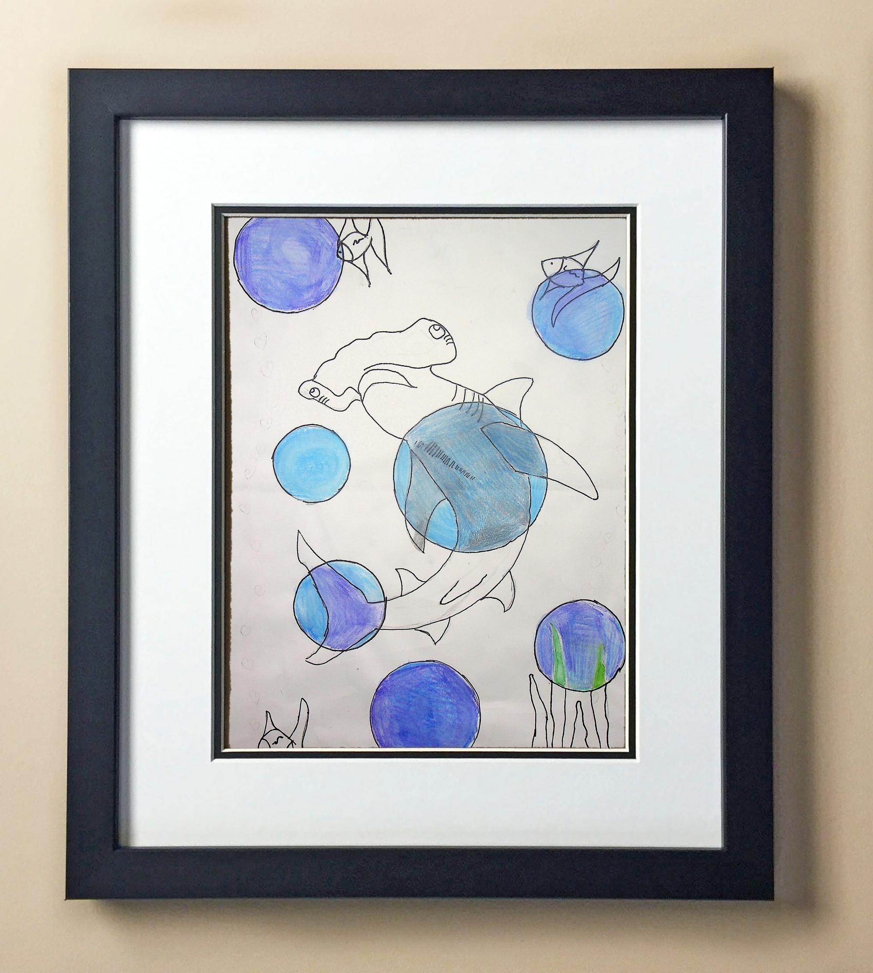 Included with the purchase is the Students Artwork, Frame, double matboard, shatter proof plexiglass, and a ready to hang backerboard with turnbuttons