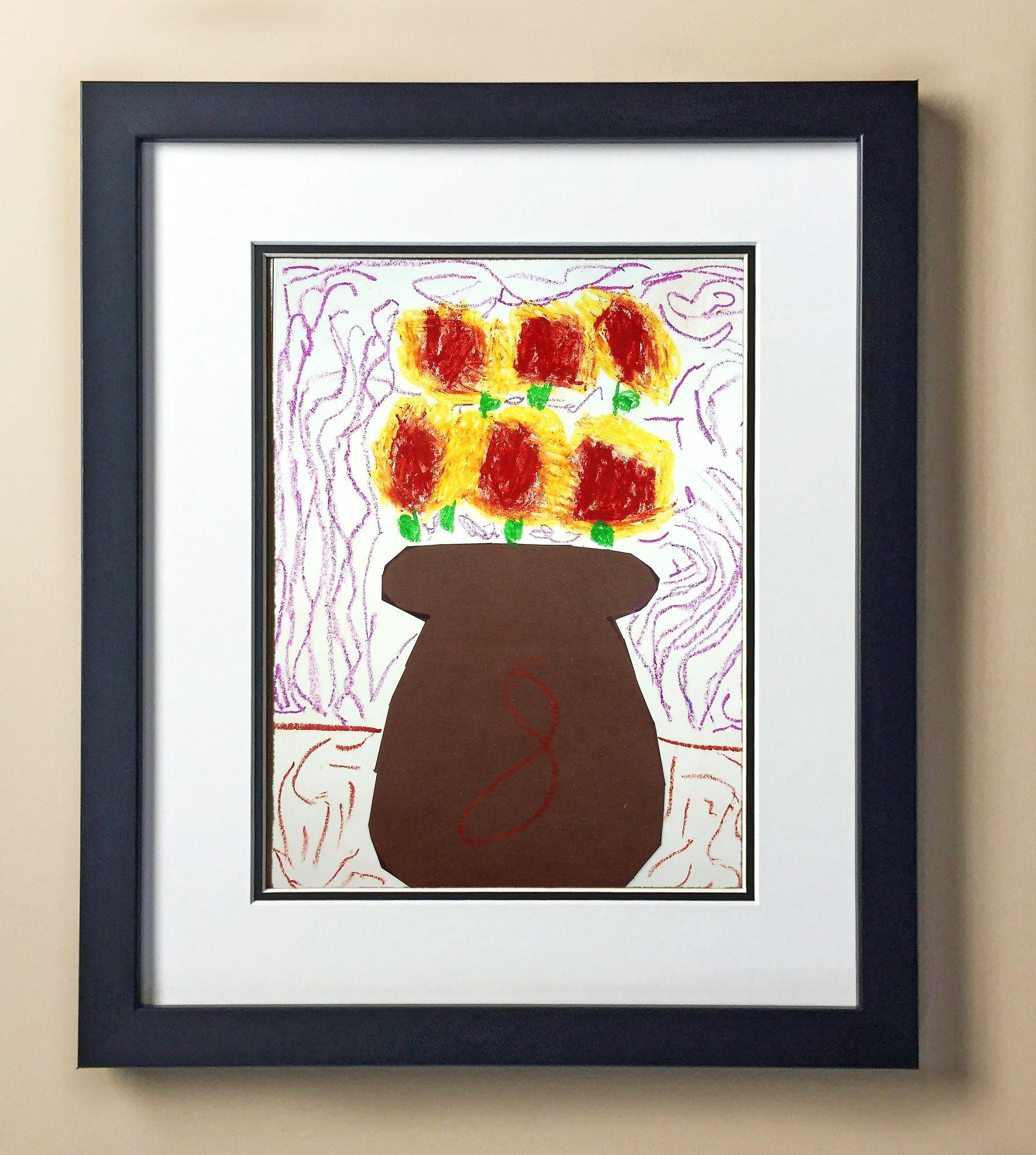 Included with the purchase is the Students Artwork, Frame, double matboard, shatter proof plexiglass, and a ready to hang backerboard with turnbuttons