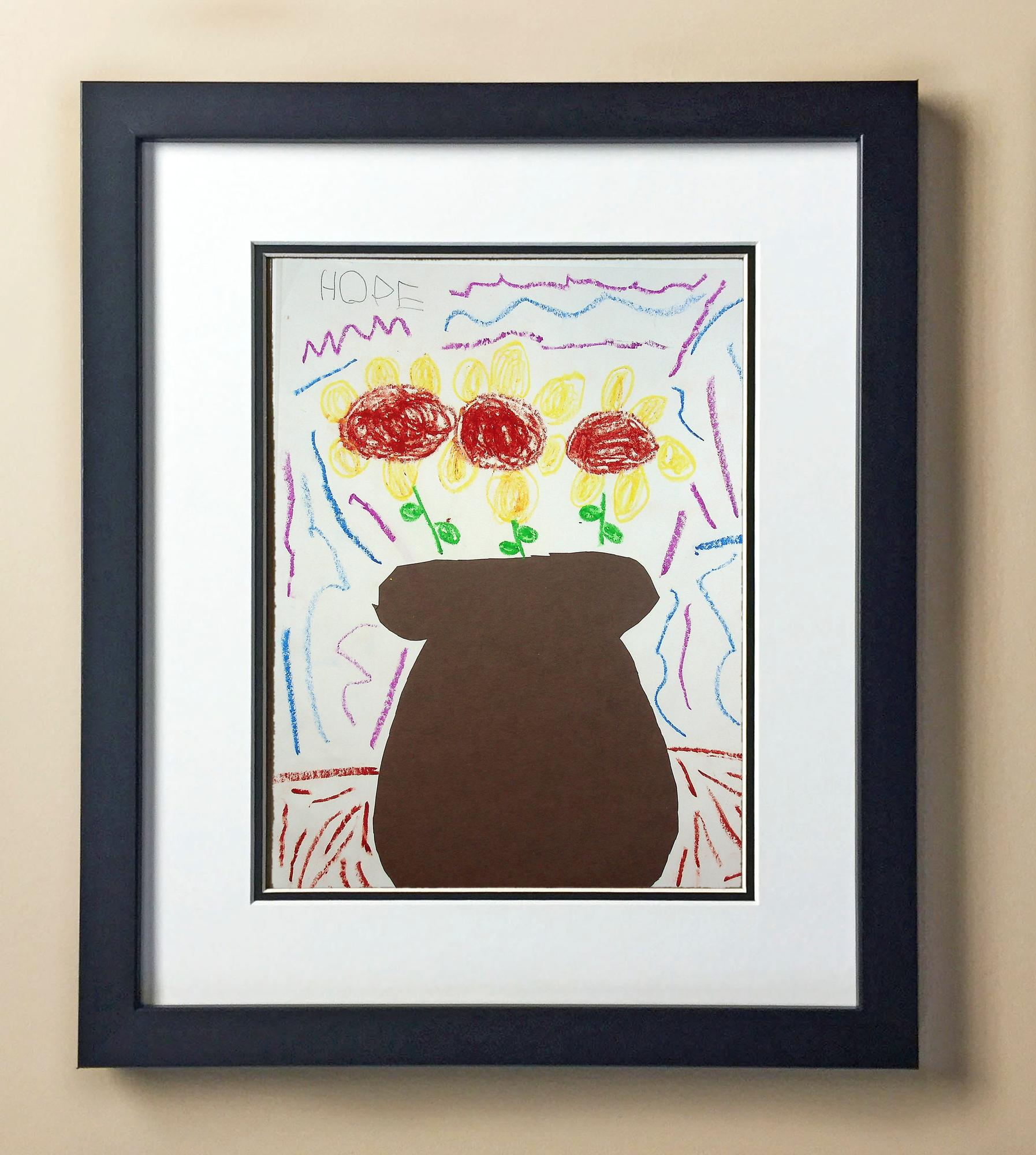 Included with the purchase is the Students Artwork, Frame, double matboard, shatter proof plexiglass, and a ready to hang backerboard with turnbuttons