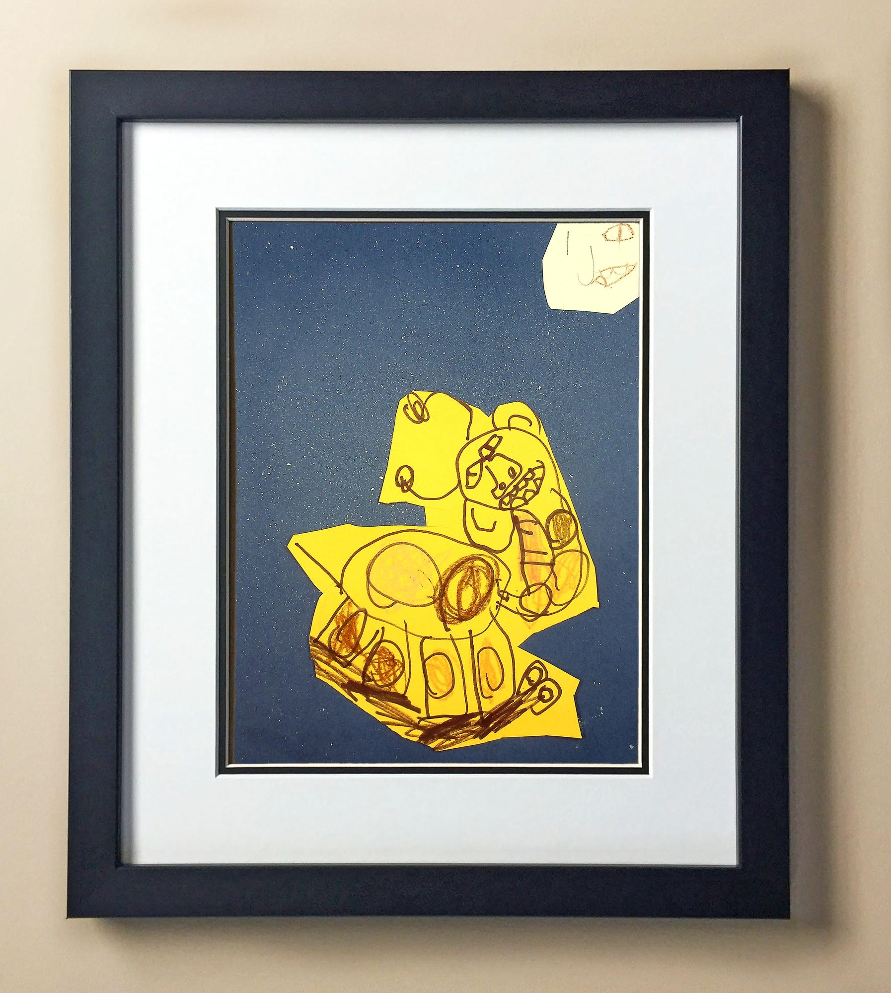 Included with the purchase is the Students Artwork, Frame, double matboard, shatter proof plexiglass, and a ready to hang backerboard with turnbuttons