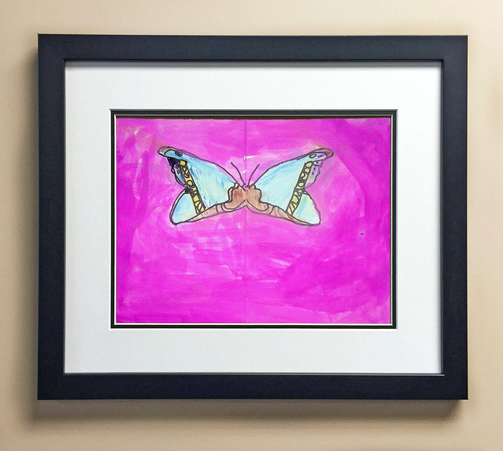 Included with the purchase is the Students Artwork, Frame, double matboard, shatter proof plexiglass, and a ready to hang backerboard with turnbuttons