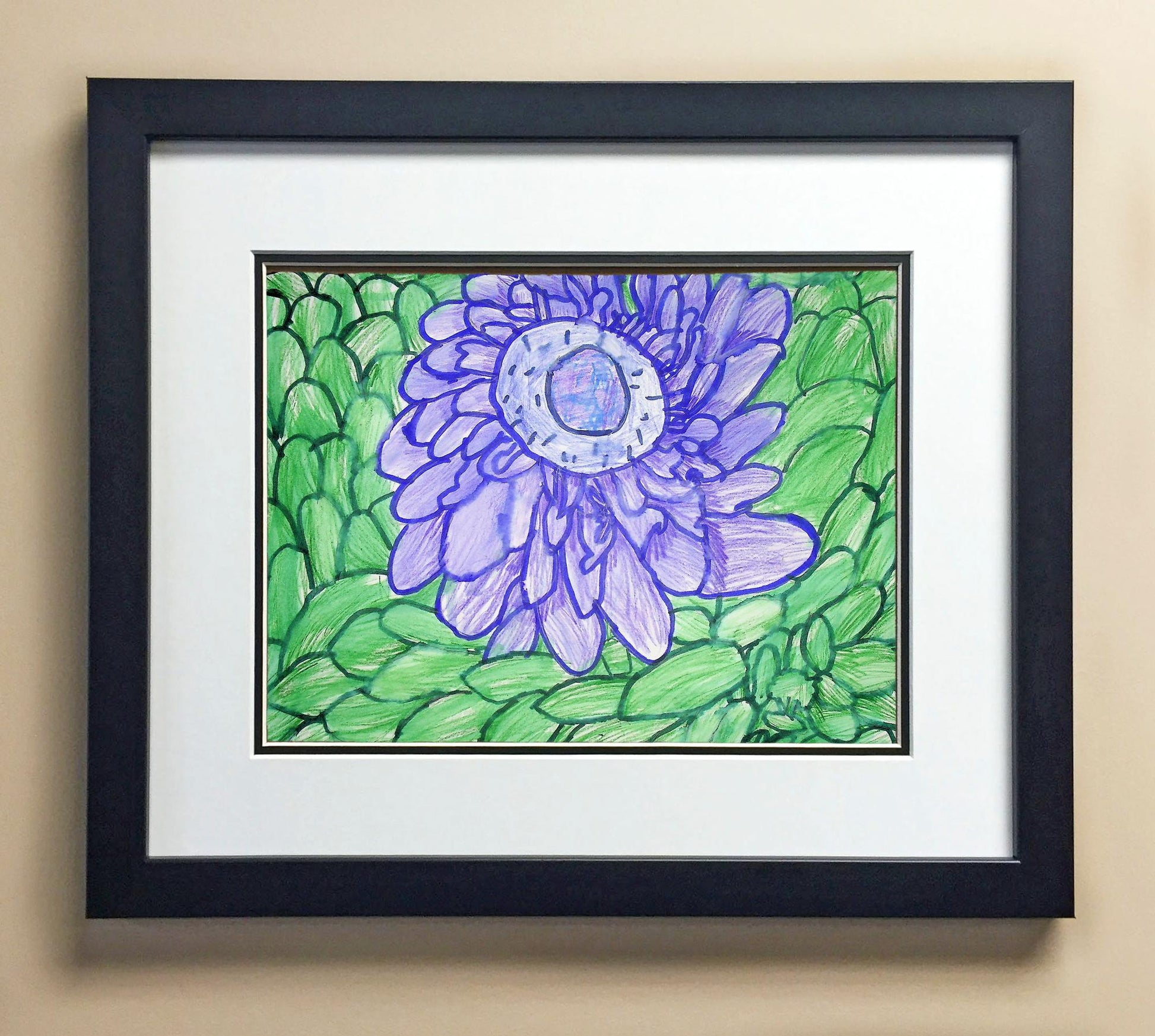 Included with the purchase is the Students Artwork, Frame, double matboard, shatter proof plexiglass, and a ready to hang backerboard with turnbuttons