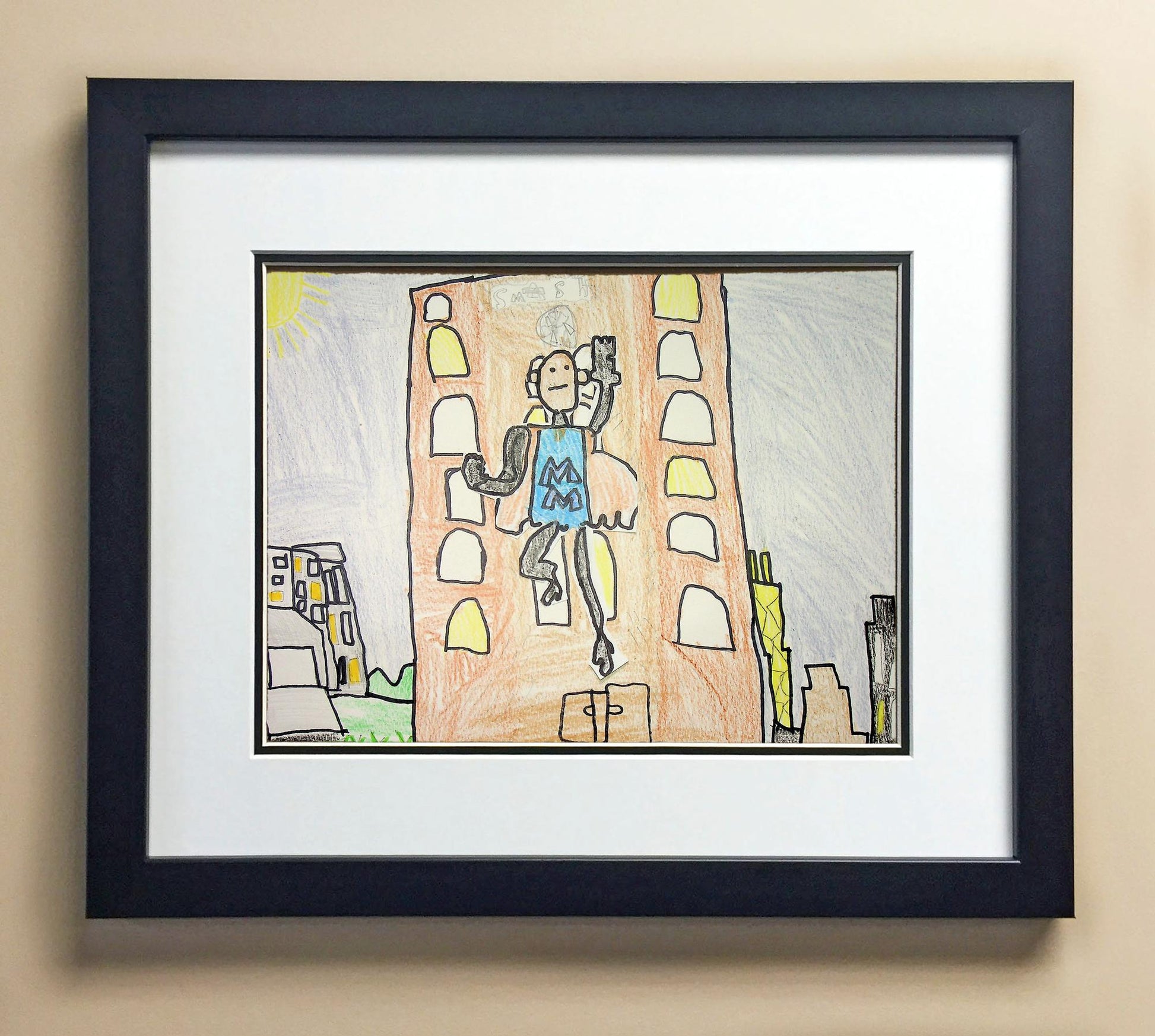 Included with the purchase is the Students Artwork, Frame, double matboard, shatter proof plexiglass, and a ready to hang backerboard with turnbuttons