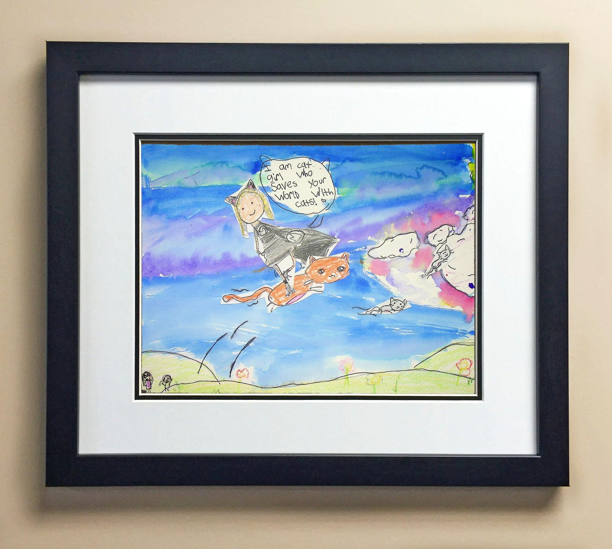 Included with the purchase is the Students Artwork, Frame, double matboard, shatter proof plexiglass, and a ready to hang backerboard with turnbuttons