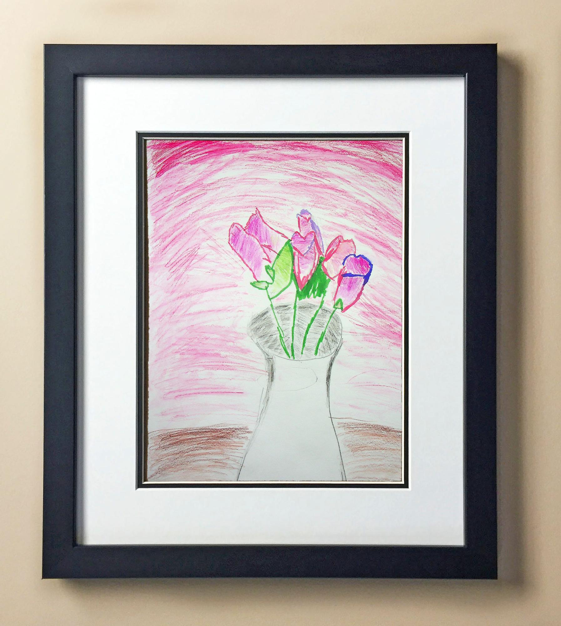 Included with the purchase is the Students Artwork, Frame, double matboard, shatter proof plexiglass, and a ready to hang backerboard with turnbuttons