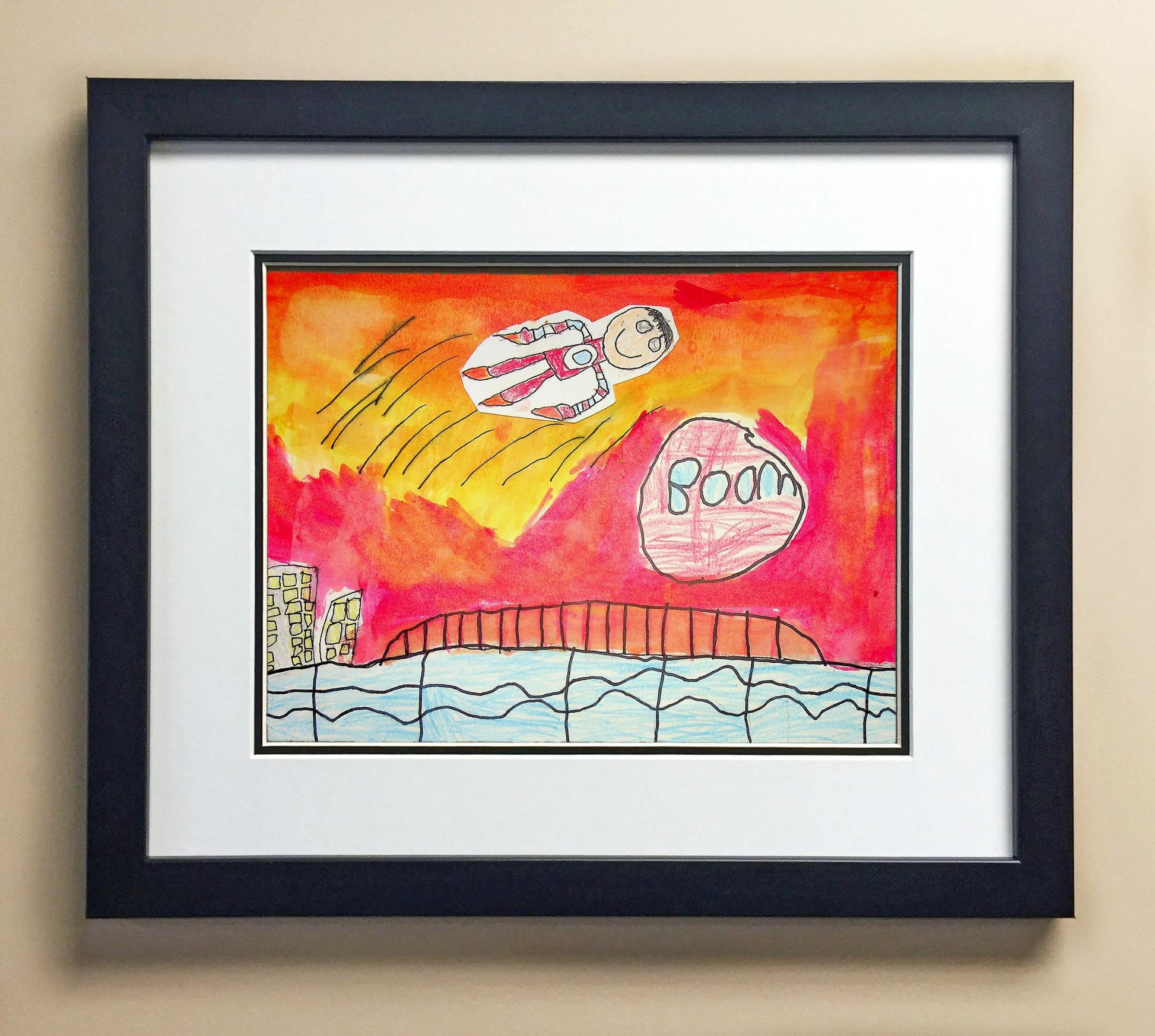Included with the purchase is the Students Artwork, Frame, double matboard, shatter proof plexiglass, and a ready to hang backerboard with turnbuttons