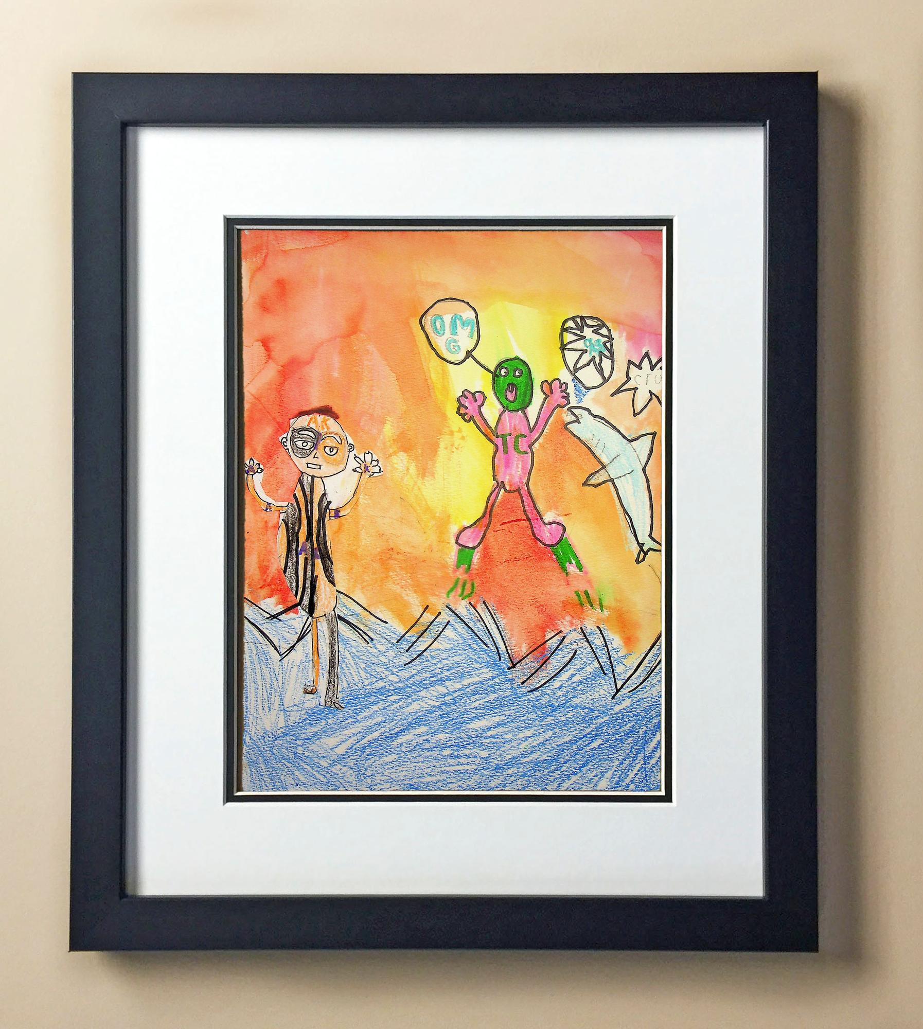 Included with the purchase is the Students Artwork, Frame, double matboard, shatter proof plexiglass, and a ready to hang backerboard with turnbuttons