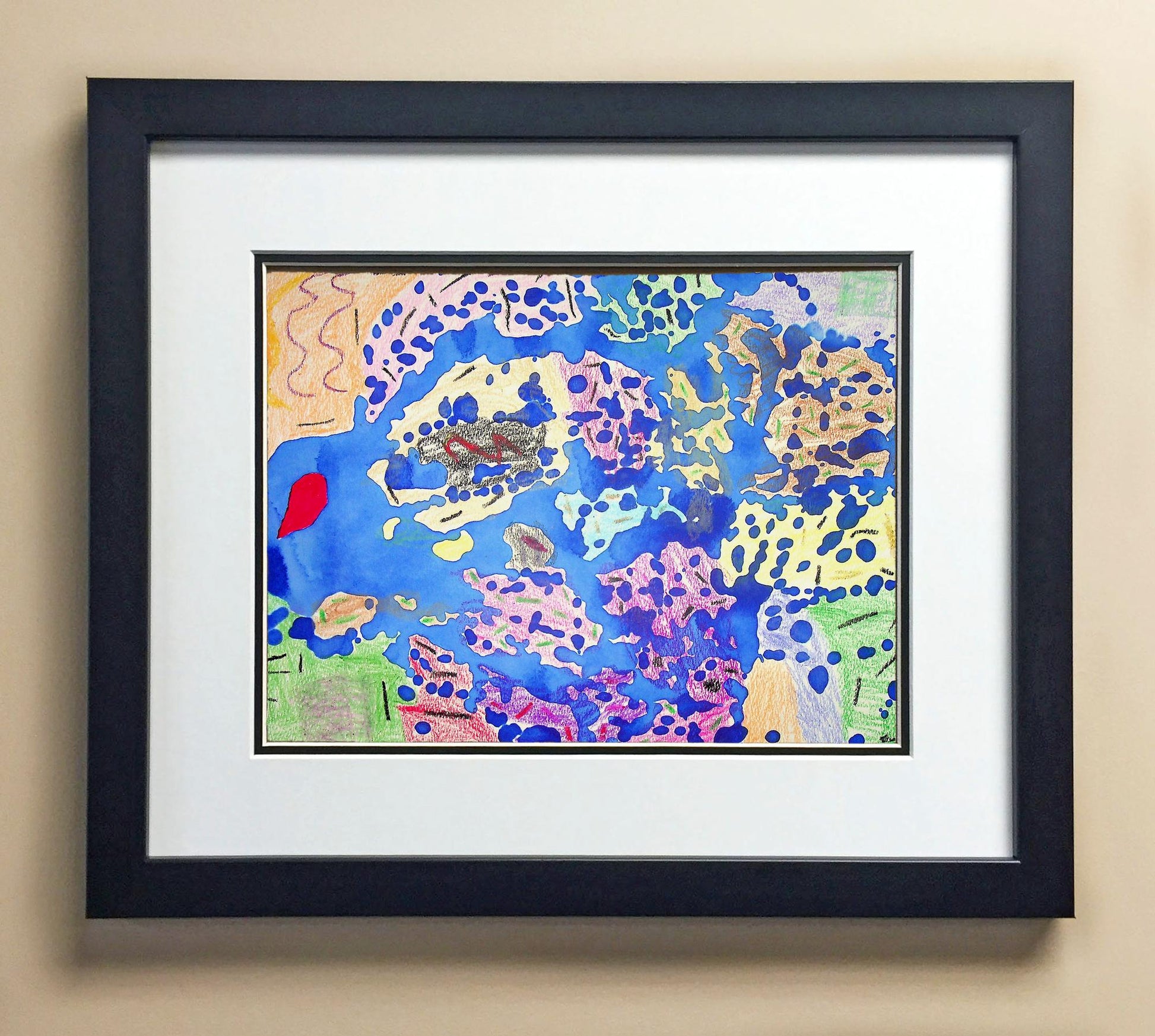 Included with the purchase is the Students Artwork, Frame, double matboard, shatter proof plexiglass, and a ready to hang backerboard with turnbuttons