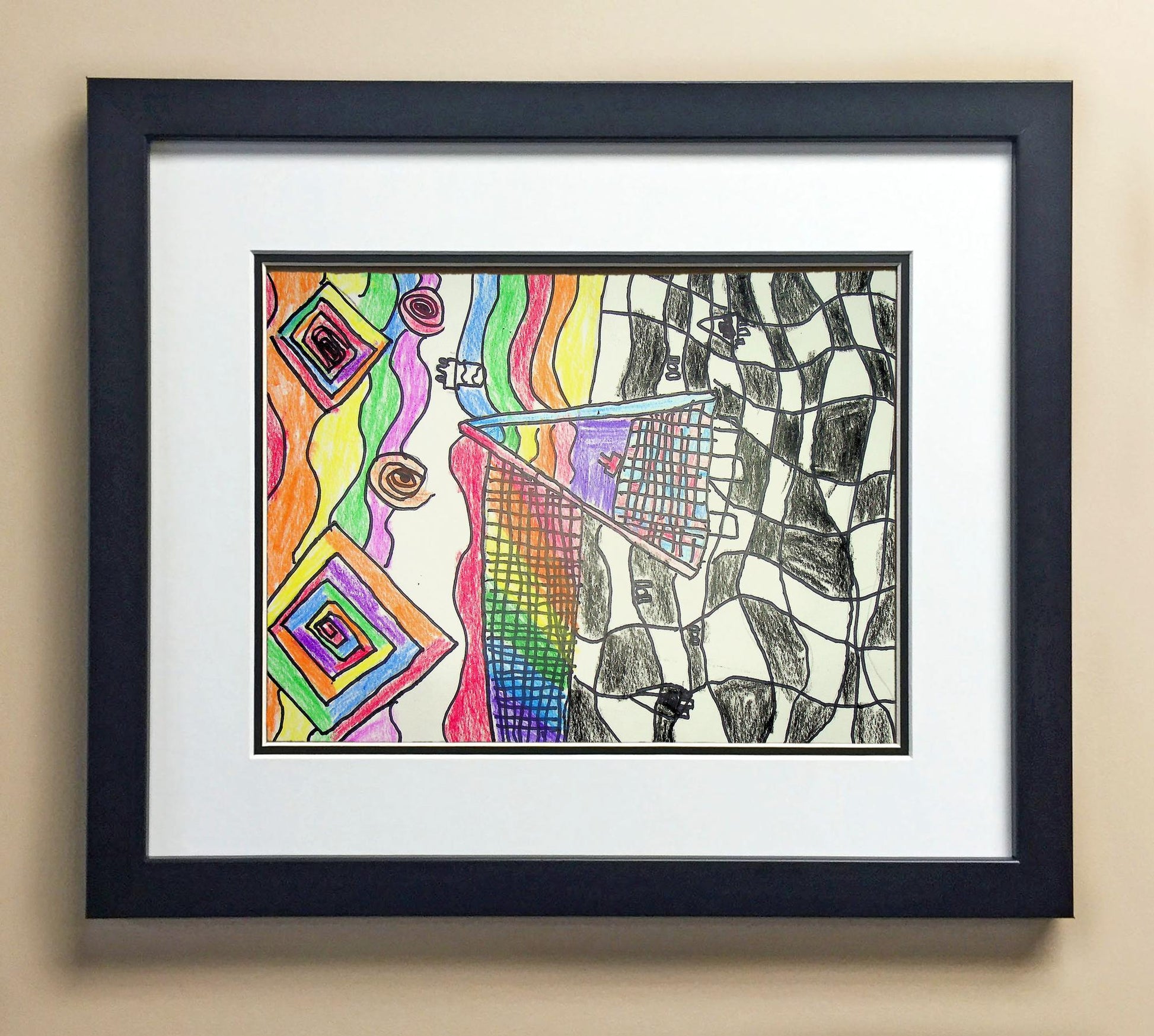 Included with the purchase is the Students Artwork, Frame, double matboard, shatter proof plexiglass, and a ready to hang backerboard with turnbuttons