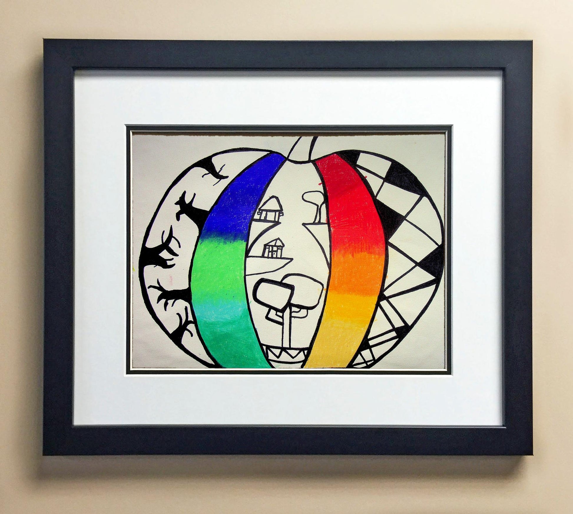 Included with the purchase is the Students Artwork, Frame, double matboard, shatter proof plexiglass, and a ready to hang backerboard with turnbuttons