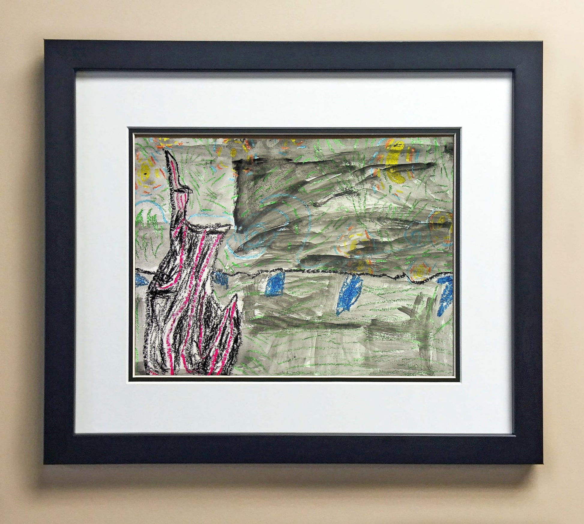 Included with the purchase is the Students Artwork, Frame, double matboard, shatter proof plexiglass, and a ready to hang backerboard with turnbuttons