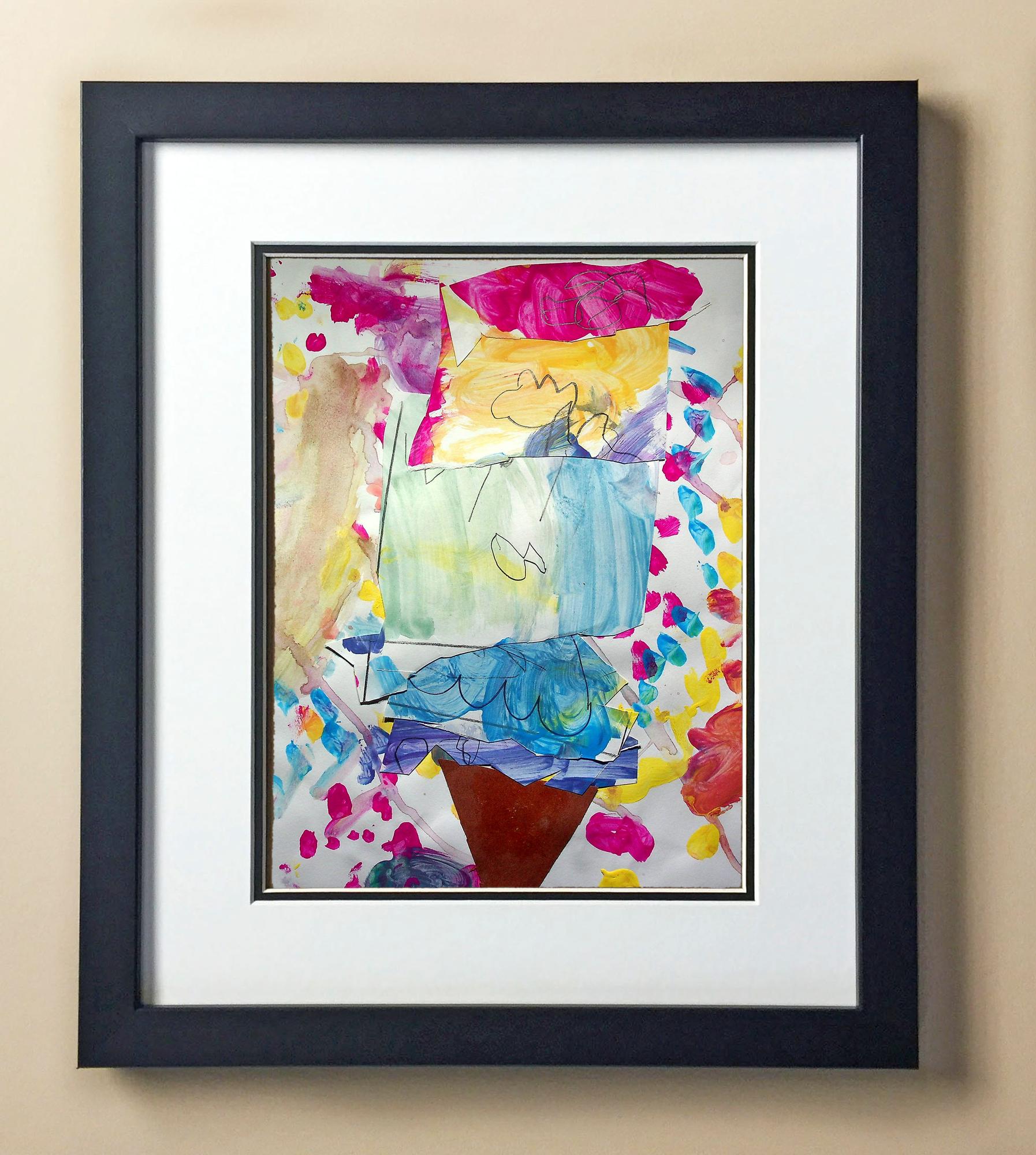 Included with the purchase is the Students Artwork, Frame, double matboard, shatter proof plexiglass, and a ready to hang backerboard with turnbuttons